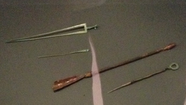 Puis les masques de beauté du visage (à base de mie de pain et de lait), l’épilation (avec de la mie de pain roulée, une pierre ponce ou des pinces), les massages (la peau, enduite d’huile, était ensuite raclée avec un strigilis, racloir — on en voit un ci-dessous 2ème instrument à gauche en partant du haut), l’hygiène des dents et de la bouche (avec cure-dents faits d’épines de lentisque), et enfin des parfums, venus de Grèce ou du Moyen Orient.