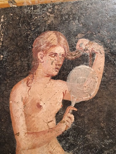 On voit ci-dessous une femme se coiffant et se regardant dans un miroir (fresque de Stabies, Italie) ainsi qu’un miroir en argent (de Pompéi) et des épingles à cheveux :