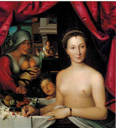 Afin de faciliter la comparaison avec l’œuvre anonyme, voici un portrait de Diane de Poitiers (entourée de ses enfants et d’une nourrice) réalisé par François Clouet, huile sur bois (92,1 cm x 81,3 cm), exposé à National Gallery of Art de Washington :