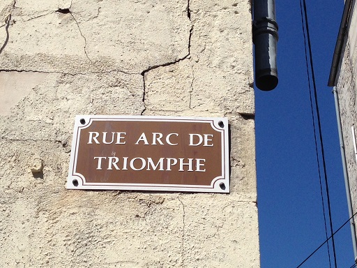 En 18-19 de notre ère, sous le règne de l’empereur Tibère, un arc de triomphe fut érigé en l’honneur de Germanicus. Ce cognomen (surnom signifiant “le Germain” et attribué en premier à Drusus l’Aîné pour ses victoires en Germanie) désigne ici Nero Claudius Germanicus, qui fut adopté par son oncle Tibère en l’an 4. Le Dictionnaire de l’Antiquité indique qu’il mourut en 19, probablement empoisonné sur l’ordre de Tibère, jaloux de celui qui était devenu un chef si admiré et populaire — qu’on comparait communément à Alexandre le Grand (coll. Bouquins, éd. Robert Laffont, p. 435).