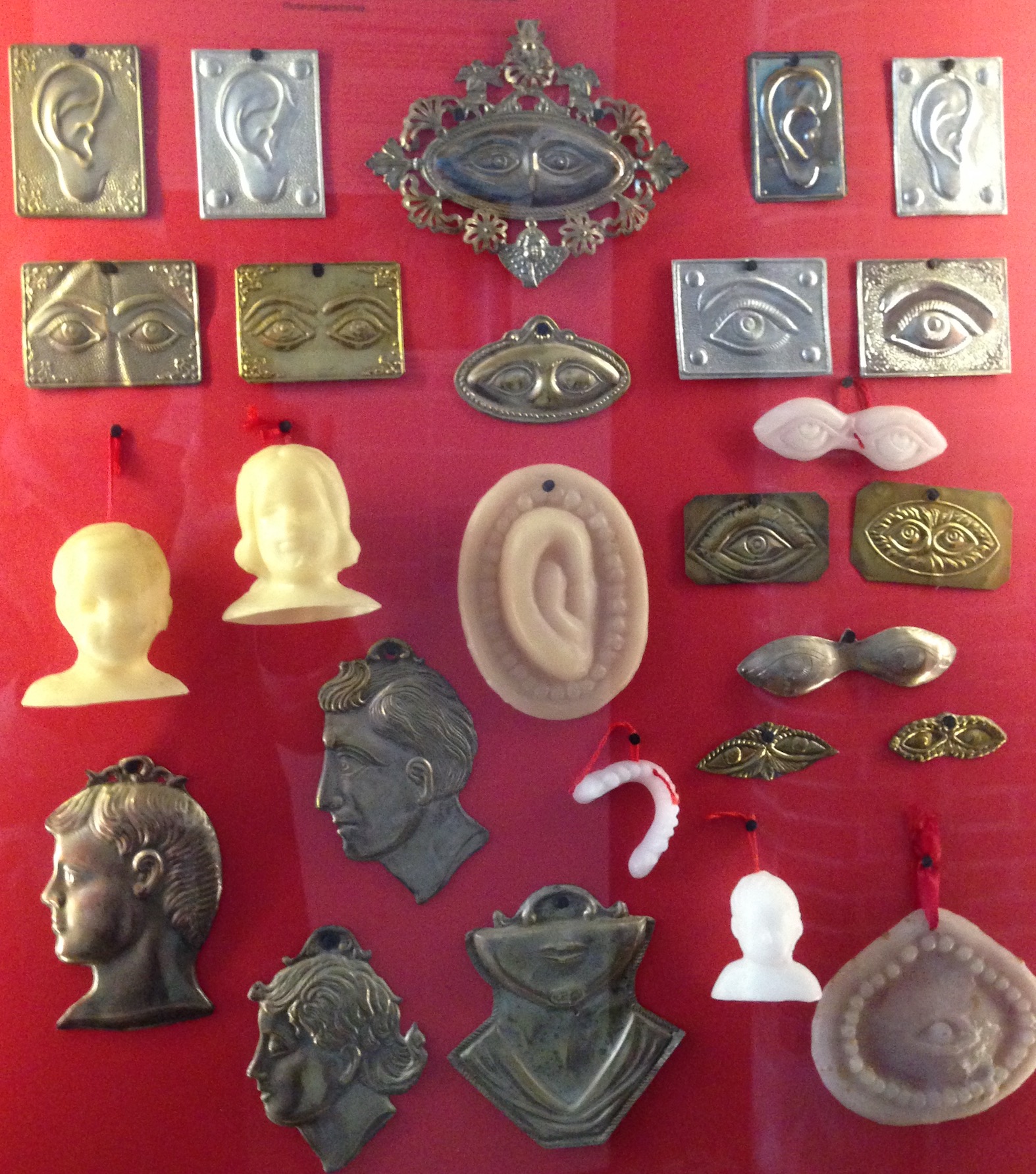La connotation religieuse est manifeste en latin — comme elle se trouve encore dans le mot ex-voto, objet symbolique placé dans une église, en reconnaissance d’une faveur obtenue.