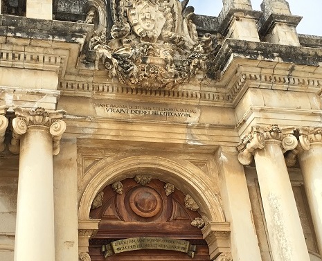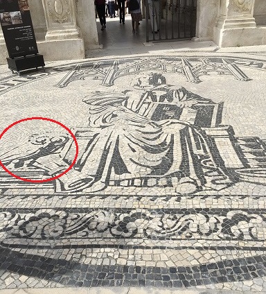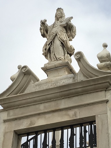 À l’entrée principale de l’université s’étend un magnifique pavement illustrant l’allégorie du savoir sous les traits de la déesse, reconnaissable à son attribut : la chouette ! Et au sommet des escaliers qui font le lien avec la ville basse — escaliers appelés justement Escadas de Minerva — s’élève une statue du XVIIIè siècle portant l’inscription latine : Sapientia aedificavit (La sagesse a construit).