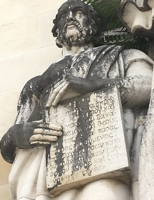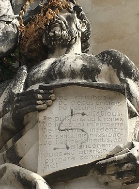 Et devant la Faculté de Médecine, se dressent les statues d’un savant grec (Hippocrate, je pense, car la tablette qu’il tient porte le titre grec ορκος orkos, le serment) et d’un savant médecin (probablement portugais) affichant les titres de ses traités scientifiques écrits en latin.