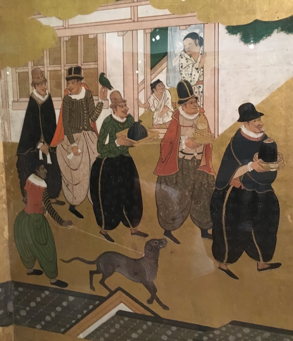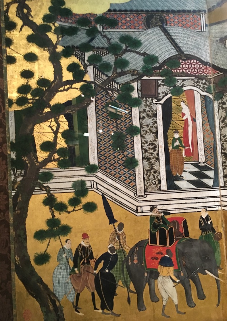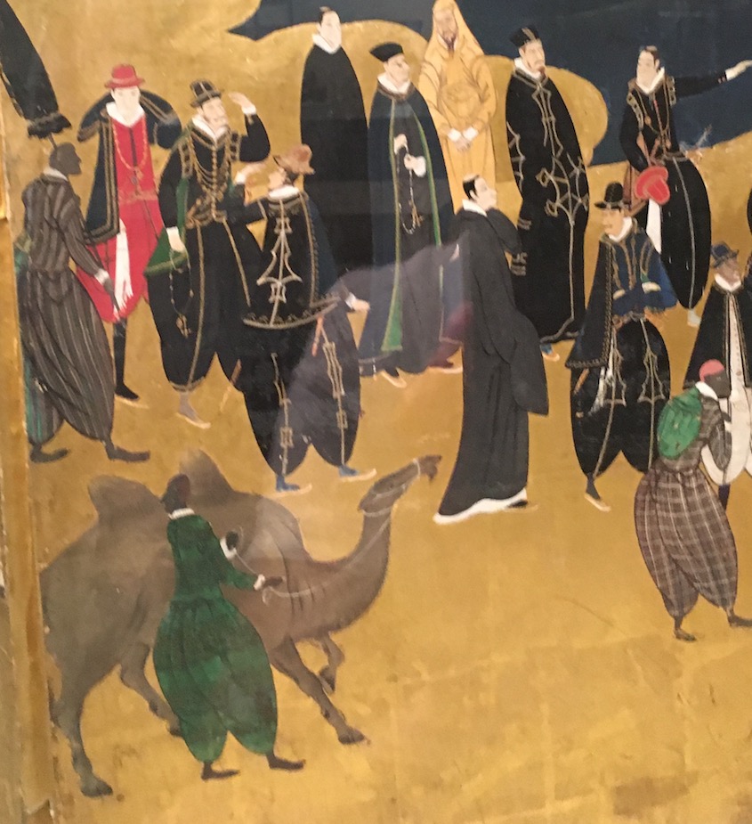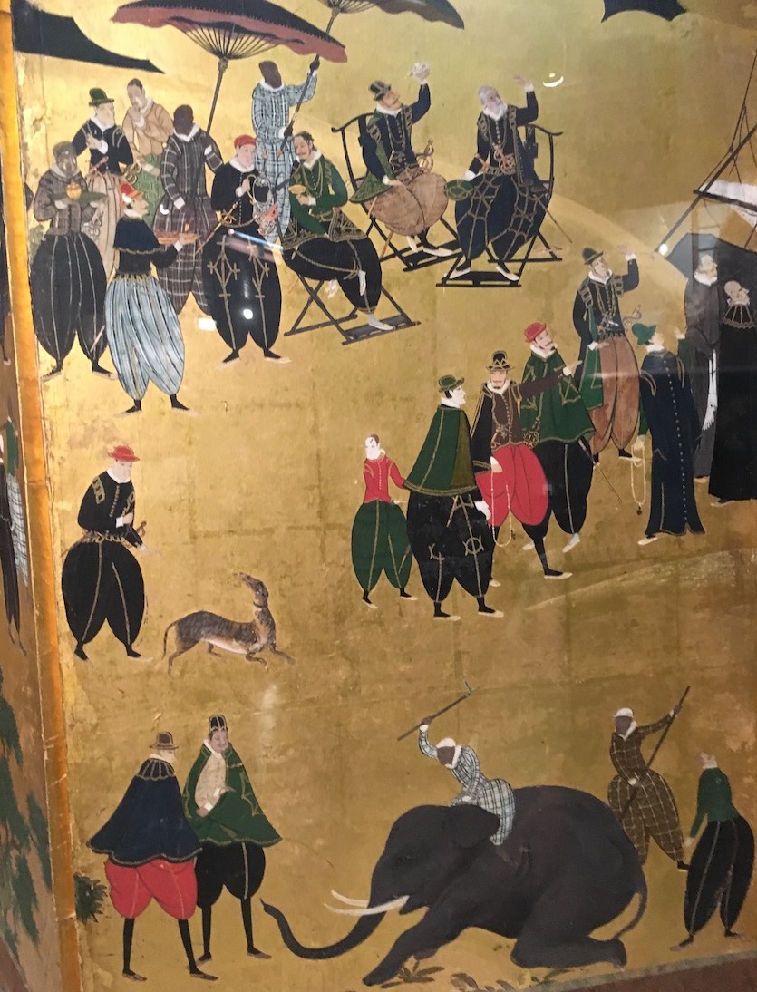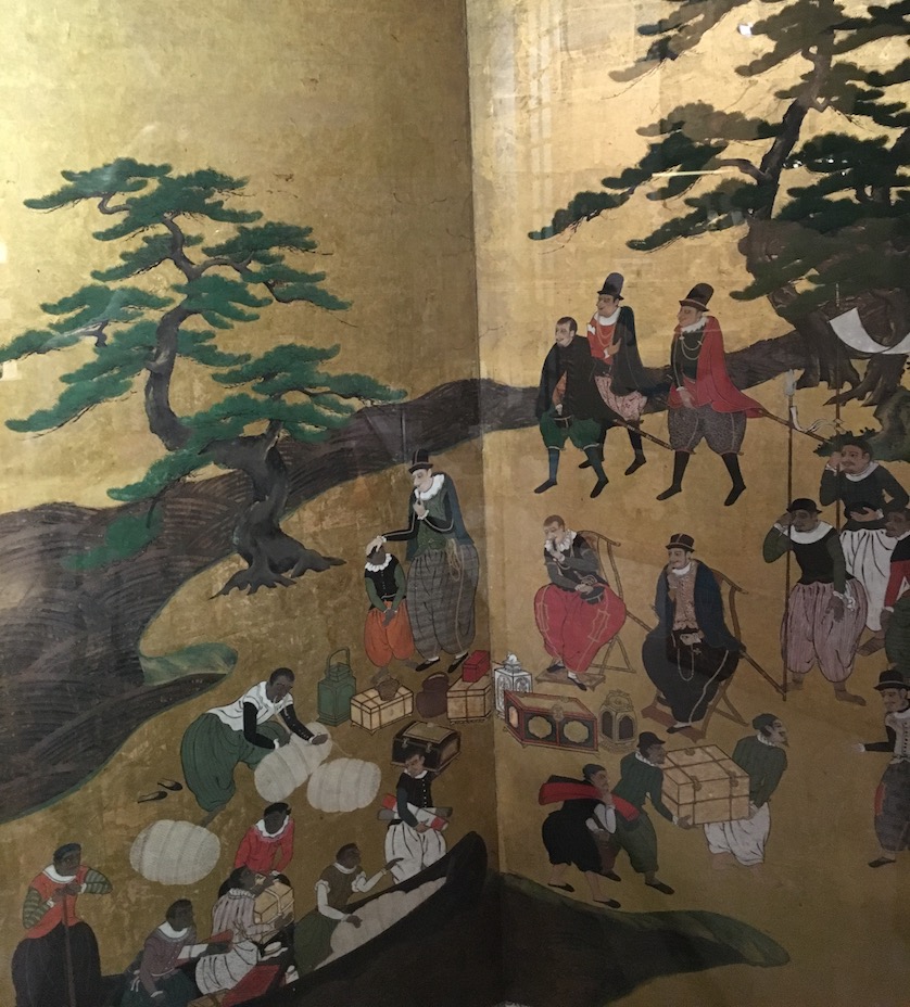 Le peintre Kano Naizen a représenté rétrospectivement tout ce qui a frappé ses compatriotes lors de l’arrivée des Portugais au Japon. Ainsi peut-on voir sur ce paravent la coexistence de deux civilisations.