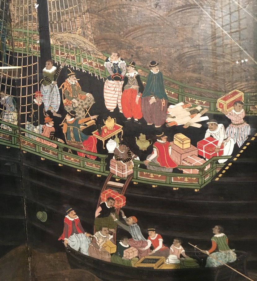 Le peintre (Kano Domi) du deuxième paravent reproduit avec minutie les ballots de soie que roulent les marins, ainsi que le chargement de la cargaison d’une caravelle (sans voiles), où de riches marchands prennent le thé !
