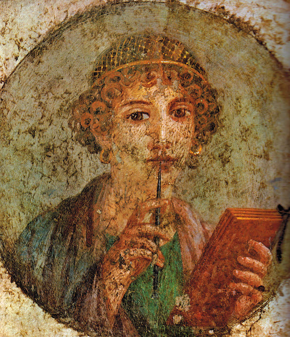 La fresque de Pompéi ci-dessous, censée représenter la poétesse grecque Sapho, montre une jeune femme qui tient un calame (ou stylus) et des tablettes. À côté se trouve le matériel d’écriture du temps des Romains (Musée de Conimbriga, Portugal).