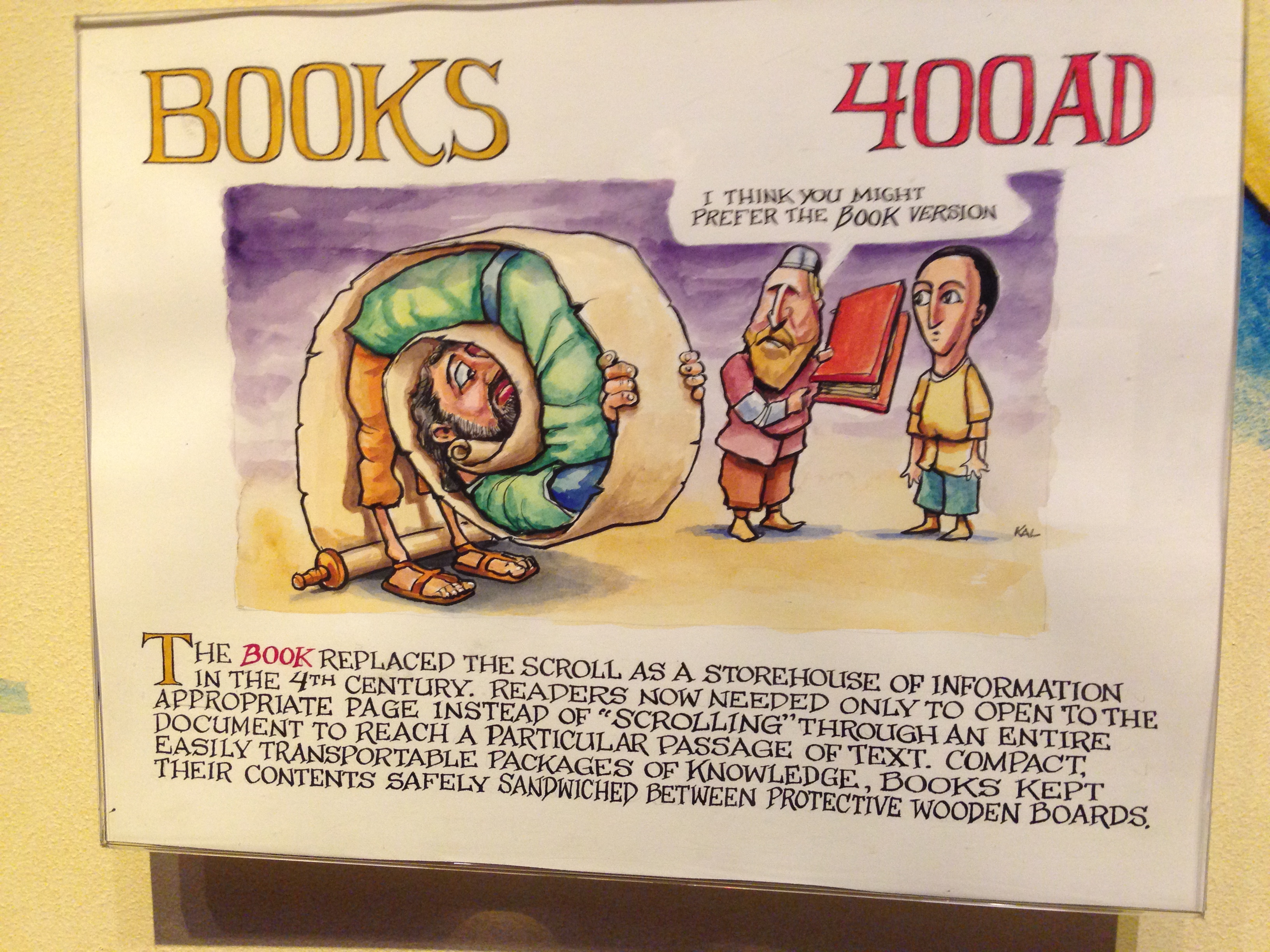 Belle occasion de dire que les “livres” n’existaient pas, à l’époque romaine, sous la forme que nous leur connaissons, et que les pièces de Térence ou les poèmes de Virgile, dont nous avons vu ci-dessus des exemplaires du XVè siècle, figuraient sur des volumina (rouleaux de manuscrits) — mot qui a donné “volume”.