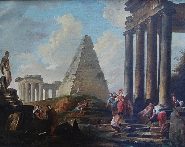 À Rome, où il a vécu onze ans, Hubert Robert a découvert les œuvres de Giovanni Paolo PANINI et il en est le plus fidèle disciple, selon L’Histoire de la peinture pour les Nuls. Comme l’Italien, le Français s’intéresse aux paysages et crée une atmosphère en y intégrant des ruines. D’où son surnom de Robert des ruines. Plus tard, on a pu dire que ses œuvres, empreintes de mélancolie, témoignaient d’une sensibilité préromantique.