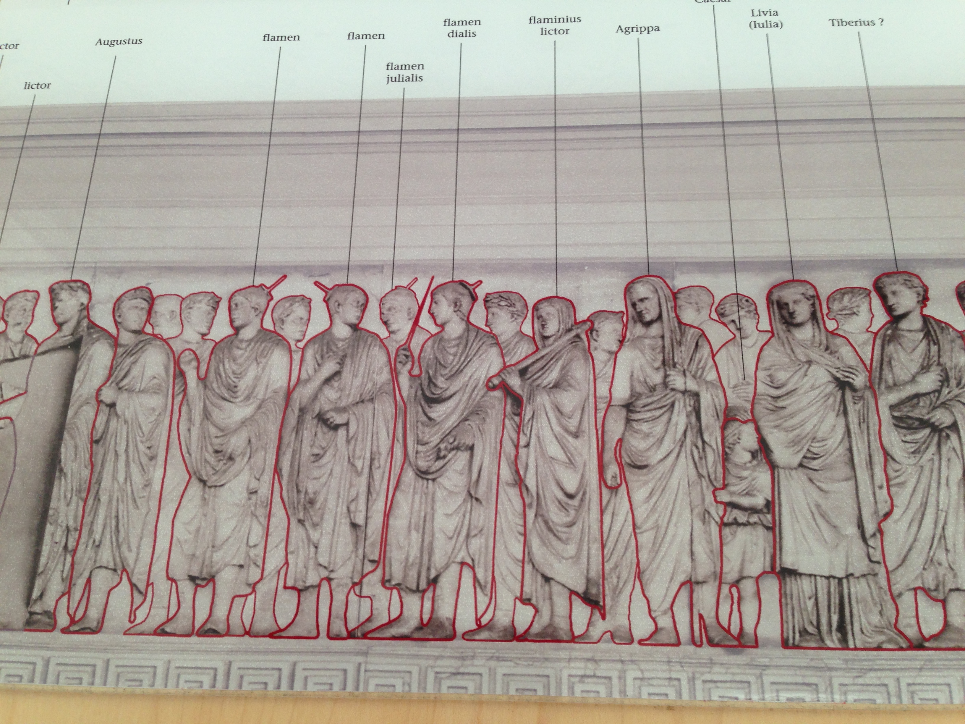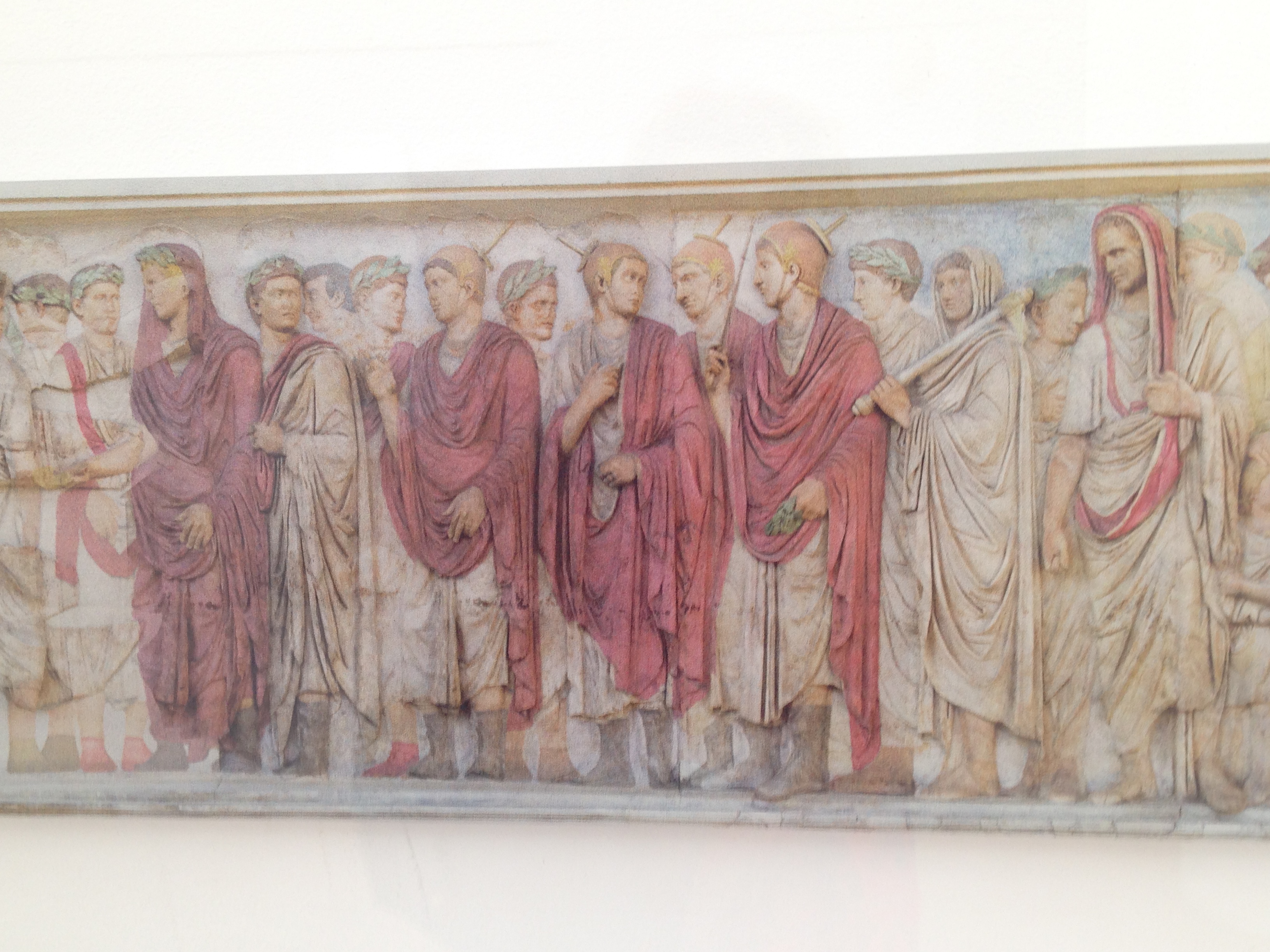 On le voit figurer ci-dessous (presque au centre) avec la famille impériale et d’éminents citoyens sur l’Ara Pacis, à Rome — autel que fit construire l’empereur Auguste pour célébrer la Paix, et inauguré le 4 juillet 13 avant notre ère.