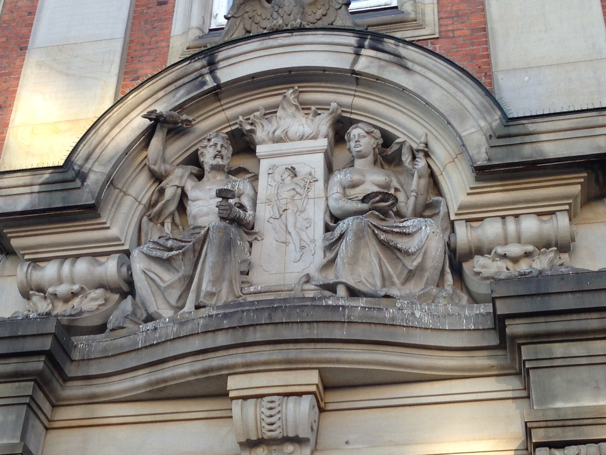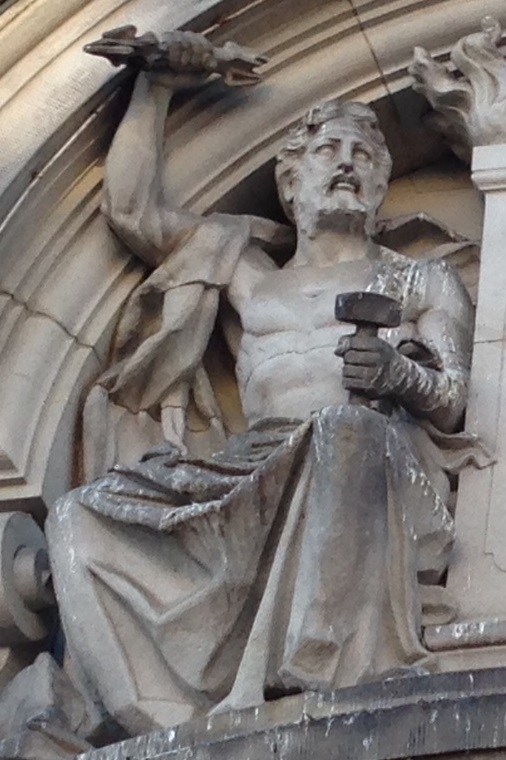 En plus de fulminer, il peut frapper ; c’est pourquoi il figure aussi parfois avec un marteau, comme sur ce fronton d’édifice ci-dessous à Copenhague.