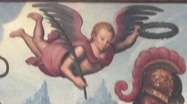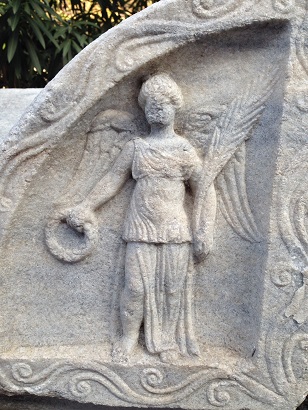 Au-dessus de Mars vole un jeune garçon ailé, vêtu d’une tunique rouge et tenant une palme dans sa main droite. Avec sa main gauche, il maintient une couronne de feuillage au-dessus du casque de Mars. Avec ses attributs, il personnifie la Victoire (Νικη, Nikê) antique — telle celle qu’on trouve sur ce sarcophage antique :