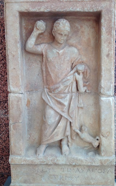 On voit ci-dessous, à gauche, une stèle en marbre de Rhodes du IIè siècle avant notre ère, représentant un garçon tenant un lièvre de la main droite et une balle de la main gauche — qu’il semble vouloir lancer au chien à ses pieds pour l’empêcher d’attraper le lièvre.