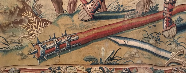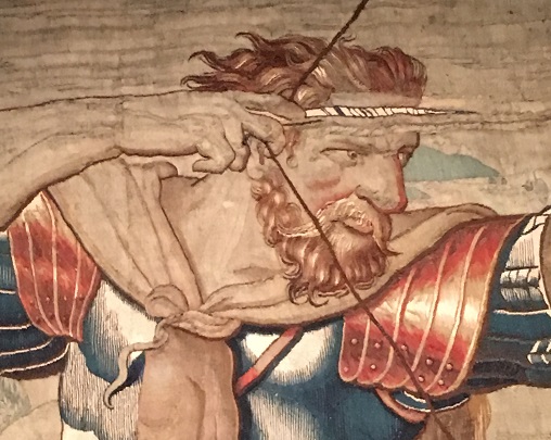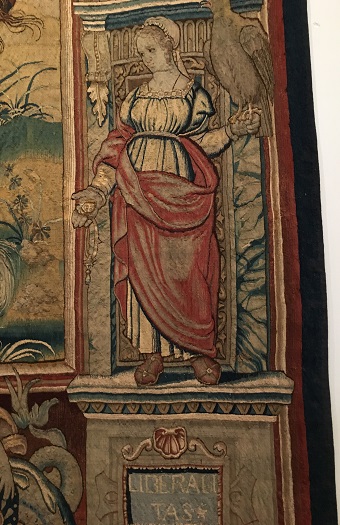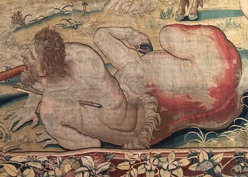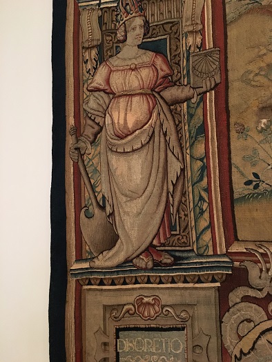De fait, les centaures symbolisaient pour les Grecs les appétits animaux et, peut-être, la barbarie (Ibid., p. 104). C’est sans doute pourquoi, dans l’esprit humaniste qui prévaut au XVIè siècle (Renaissance), la tapisserie affiche également, en contraste avec la scène centrale, deux allégories reliées à la tempérance d’un être civilisé.