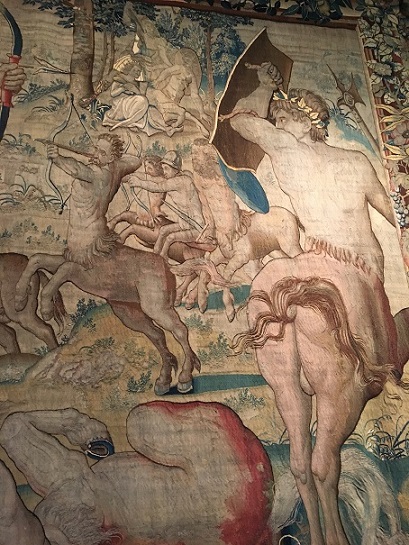 L’autre aventure où Hercule révèle sa “face sombre” est représentée sur une grande tapisserie de laine et soie, faite à Bruxelles au milieu du XVIè siècle et acquise par le Portugal en 1984. Intitulée Combat d’Hercule contre les Centaures, elle se trouve au Musée des Arts anciens (Museu de Arte antiga).