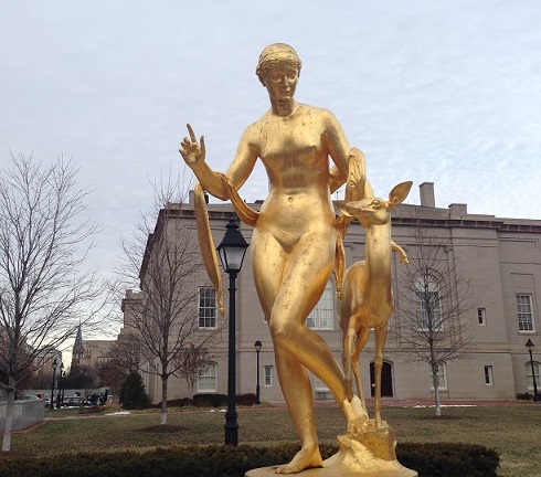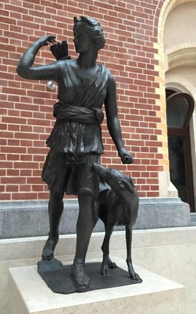 D’autre part, et presque toujours, soit elle porte une tunique courte — fait rarissime pour une figure féminine de l’Antiquité — pour faciliter sa course dans les bois, soit elle est nue — pour signifier sa pureté. Dans la statuaire moderne c’est ainsi qu’elle apparaît.