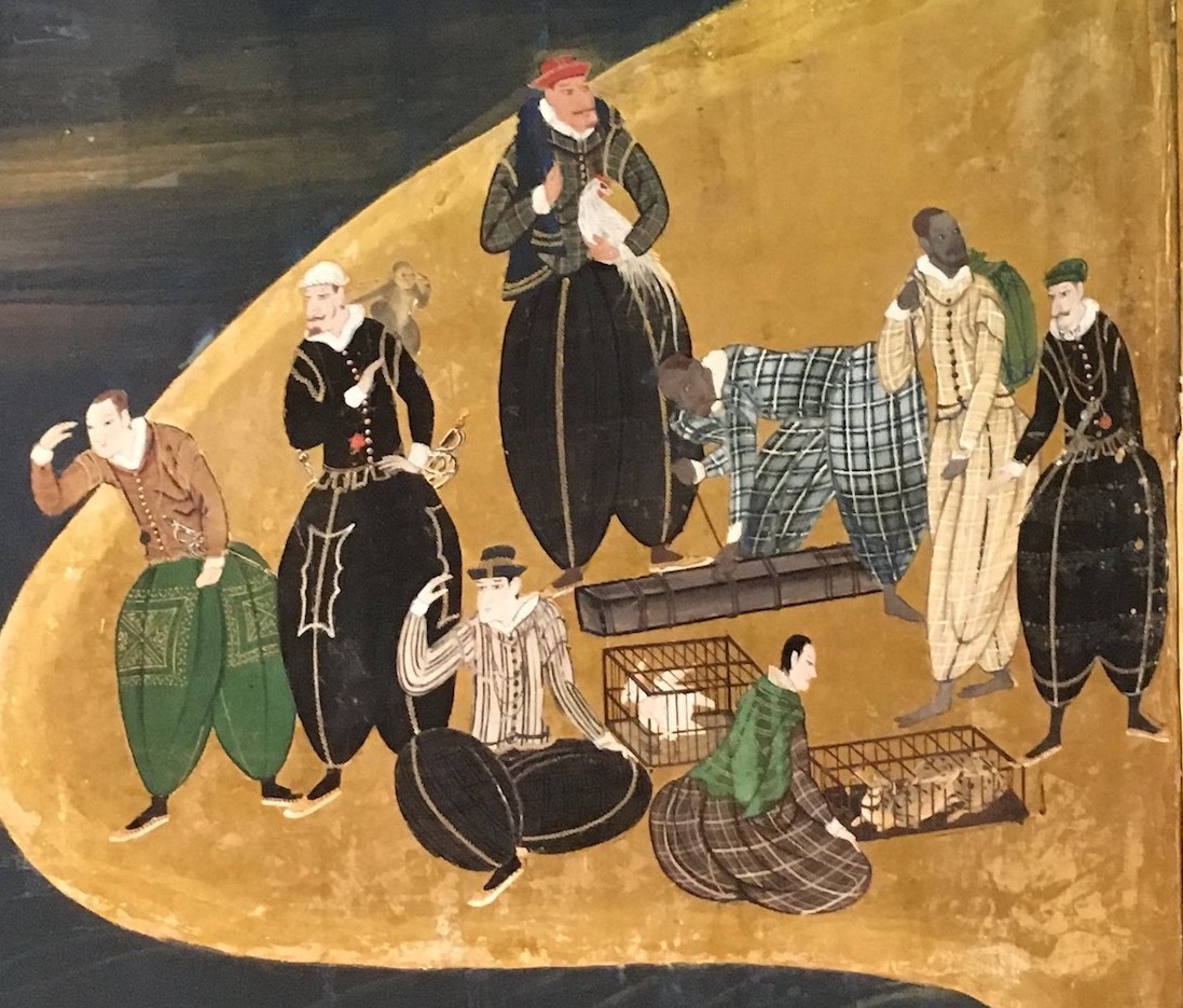 Le peintre Kano Naizen a représenté rétrospectivement tout ce qui a frappé ses compatriotes lors de l’arrivée des Portugais au Japon. Ainsi peut-on voir sur ce paravent la coexistence de deux civilisations.
