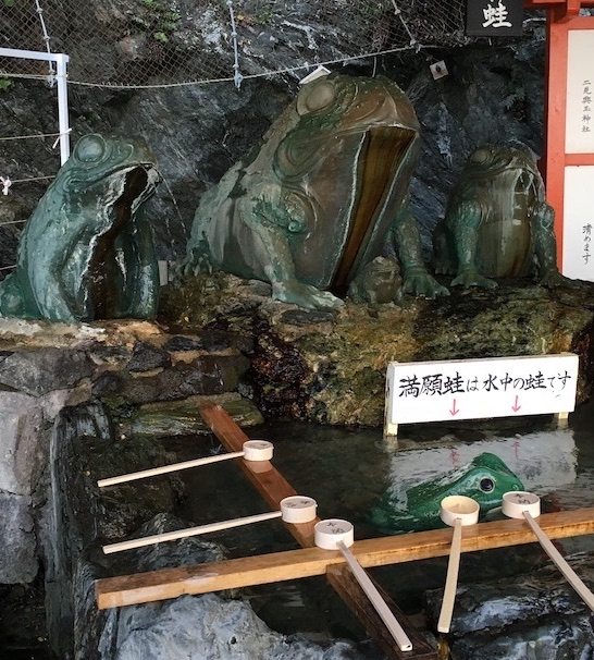 Outre son caractère protecteur, la grenouille japonaise est un porte-bonheur, et elle incarne la ténacité, la persévérance, l’espérance — des vertus positives. Ainsi, à l’entrée d’un temple de Shuzenji (Péninsule d’Izu), ai-je vu ce dessin punaisé sur un panneau :