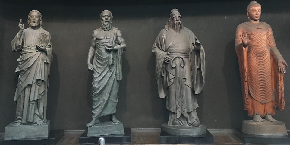Lors d’une excursion à Yokohama, j’ai visité un lieu unique au Japon (et peu touristique) : une sorte de temple à la gloire de philosophies et religions du monde, représentées ici par quelques figures, dont Socrate.