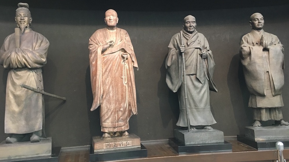 Dans la partie gauche (quand on leur fait face) figurent Jésus-Christ, Socrate, Confucius et Shakyamuni (dit le Bouddha) — deux philosophes et deux fondateurs de religions. Dans la partie droite, ce sont quatre fondateurs de branches différentes du bouddhisme : Shotoku-Taishi, Kobo-Daishi, Shinran et Nichiren (majoritairement, des moines).