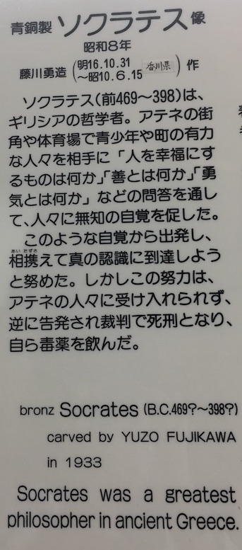 La statue qui le représente, exécutée en 1933 par Yuzo Fujikawa, est en bronze. On remarque que le Grec, réputé fort laid, a été quelque peu idéalisé. Il tient dans sa main gauche un petit bol : est-ce une allusion à la ciguë qu’il sera condamné à boire, ou bien une sorte d’assimilation avec la figure (mieux connue des Japonais) du moine bouddhiste qui a toujours un bol — pour demander l’aumône, ou pour faire une offrande aux dieux — parmi ses attributs ?
