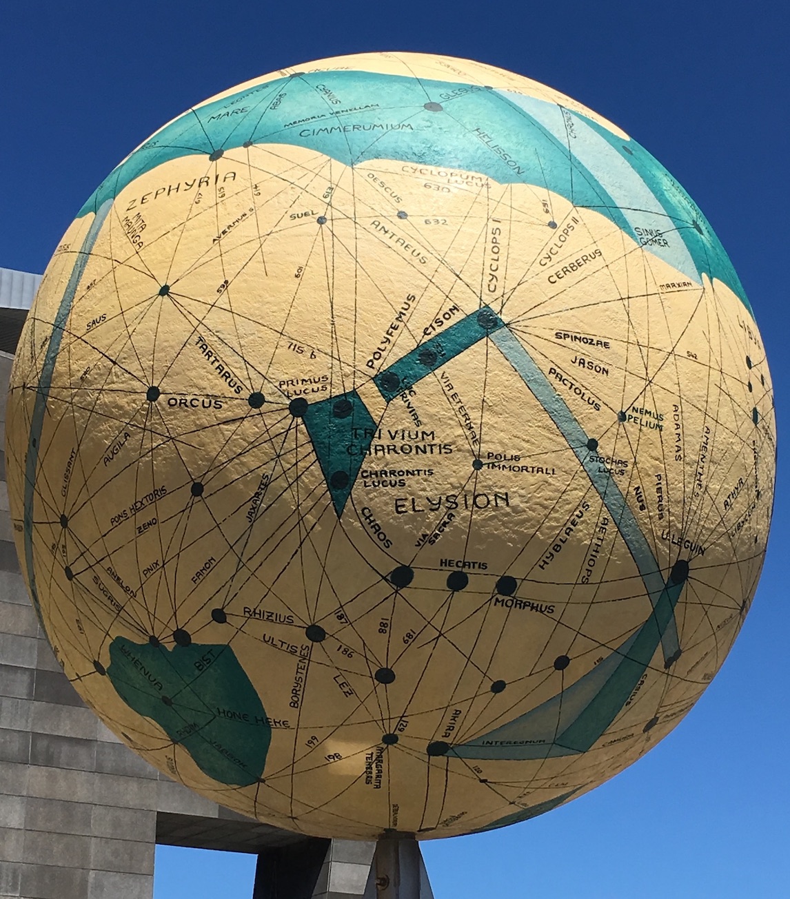 L’un de ces globes “terrestres” porte une étrange géographie des Enfers de l’Antiquité. Les toponymes proviennent de la mythologie gréco-latine. Ainsi, peut-on lire (écrits parfois de façon fantaisiste) des noms de lieux : Tartarus, le Tartare (séjour infernal des méchants), Elysion, les Champs Élysées (séjour des bienheureux), Mare Cimmerumium, la Mer des Cimmériens (aux confins du monde, près de l’Océan, pays enveloppé de brumes et d’une obscurité perpétuelle, où Ulysse rencontre les ombres des morts, dans le chant XI de l’Odyssée, selon le Dictionnaire de l’Antiquité, coll. Bouquins, p. 221), Charontis lucus, Charontis Trivium, le bois sacré de Charon, le carrefour de Charon (batelier des Enfers). On découvre également des noms de personnages fameux : Jason, le héros qui conquit la Toison d’Or, Polyfemus, le cyclope Polyphème (que le rusé Ulysse trompa et aveugla), Hecatis, Hécate (divinité infernale), Cerberus, Cerbère (le chien à trois têtes, gardien des Enfers), Orcus (dieu des Enfers dont ni les Grecs ni les Romains ne prononçaient le nom … mais il semblerait que le mot français “ogre” en dérive) etc.