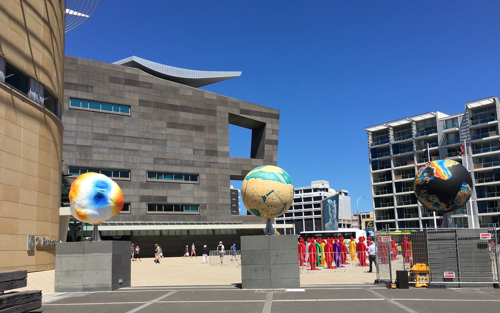 Enfin, tout au Sud de l’île du Nord, à Wellington, j’ai surtout été frappée par ces œuvres d’art placées sur l’esplanade du Musée Te Papa.