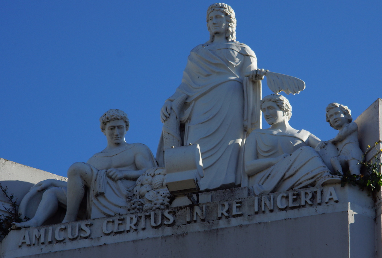Au sommet de cet immeuble se détache un groupe de sculptures à la mode antique. Une inscription en latin porte les mots suivants : Amicus certus in re incerta.