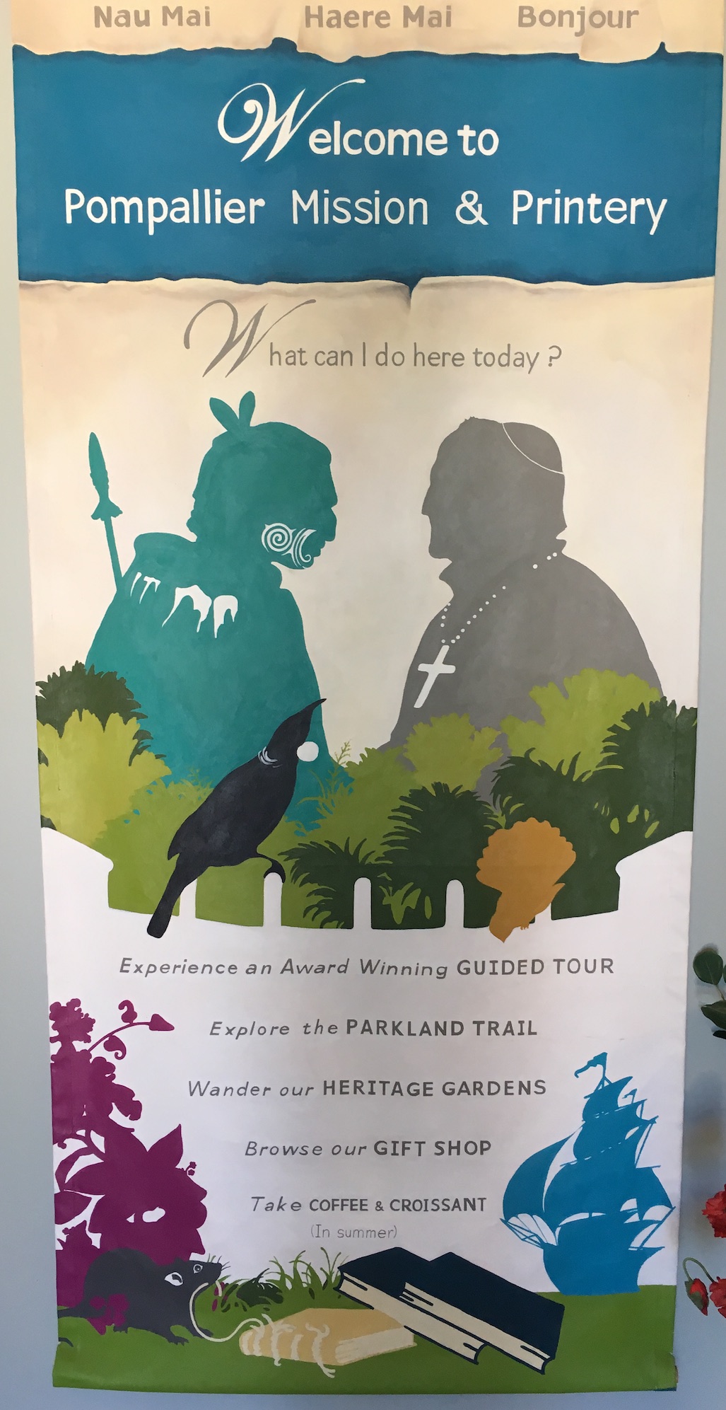 Ne quittons pas cet endroit pittoresque sans mentionner, à Russell, la Mission Pompallier, du nom d’un prélat français appartenant à la communauté des Maristes, qui est venu au XIXè siècle installer une imprimerie pour fabriquer des bibles, afin d’évangéliser les populations ! Dans le jardin de la propriété un cadran solaire porte deux mots latins : Tempus fugit.