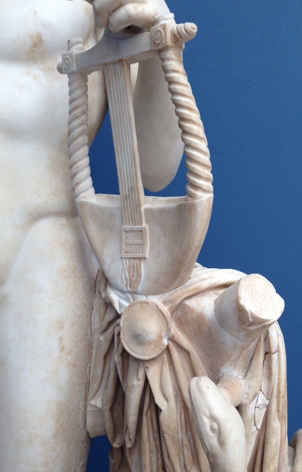Les Grecs attribuaient à plusieurs divinités la création de tel ou tel instrument de musique : Athéna, par exemple, aurait inventé la flûte. Mais c’est Apollon qui aurait inventé la musique, et en particulier la lyre (visible sur la statue ci-dessus). Cette invention, d’ailleurs, il la dispute à Orphée, fils d’une Muse … et qui jouait de la lyre si merveilleusement qu’il pouvait charmer les bêtes sauvages et mouvoir même les arbres et les pierres par sa musique (Antiquité, p. 703).