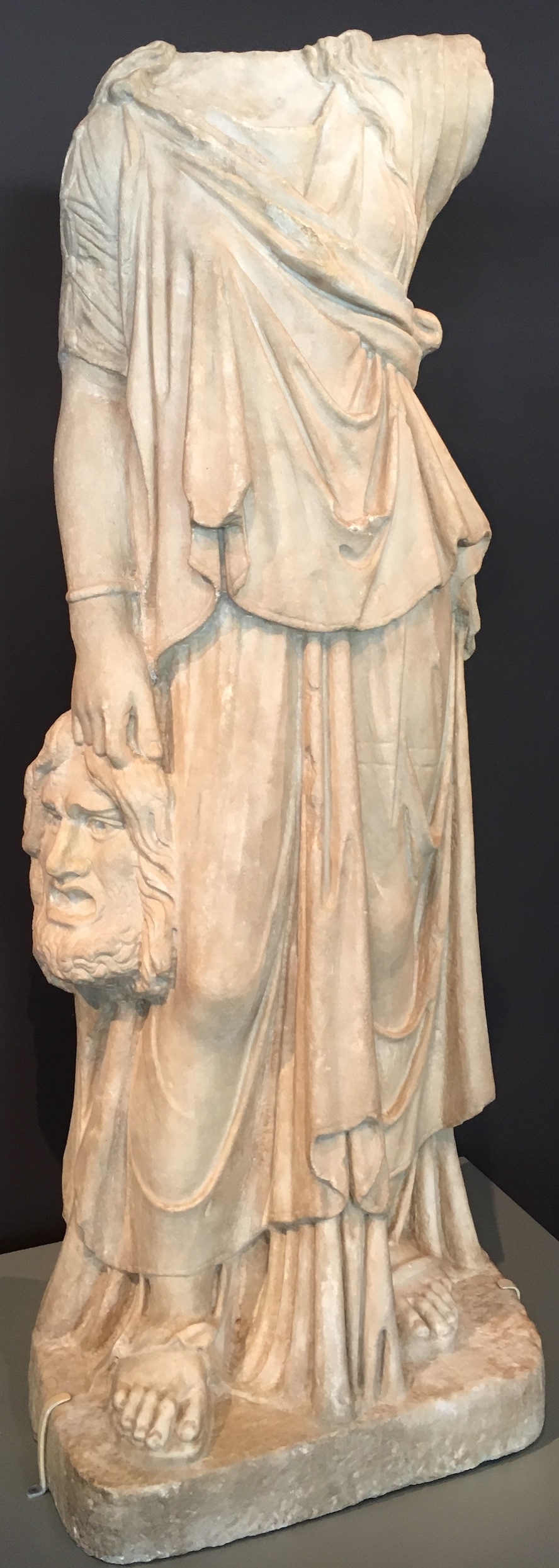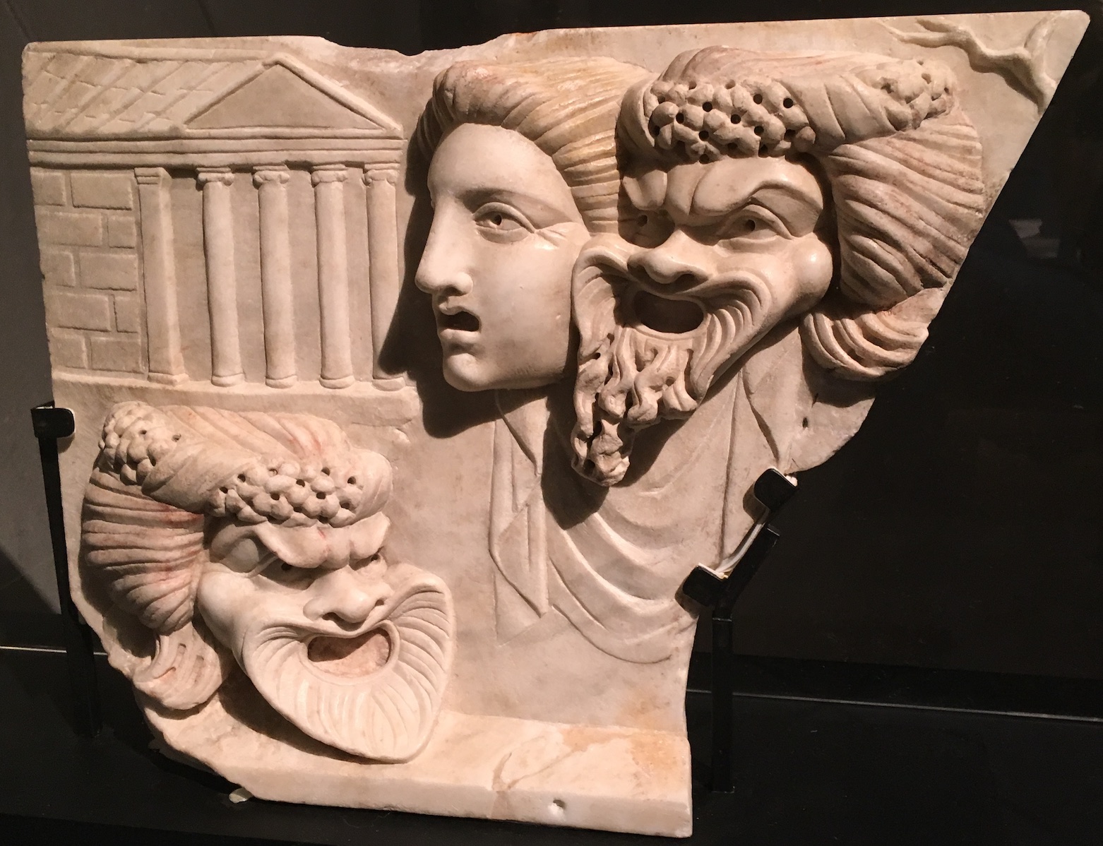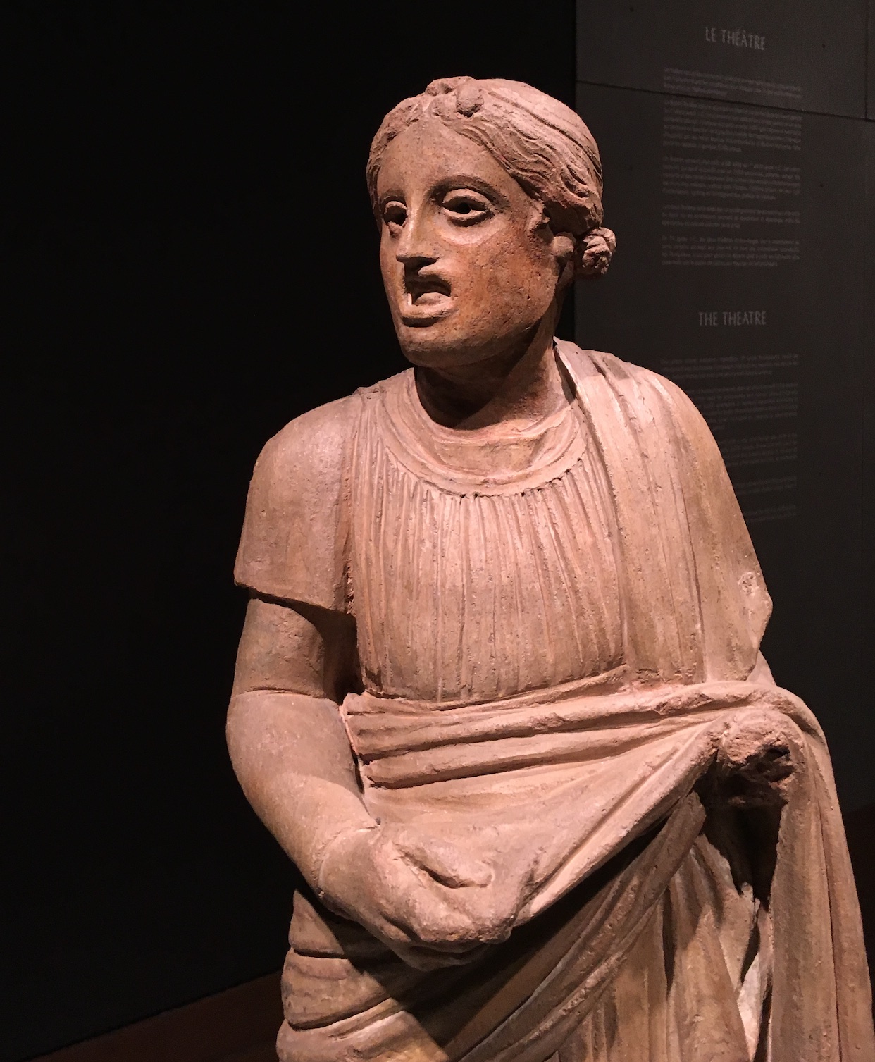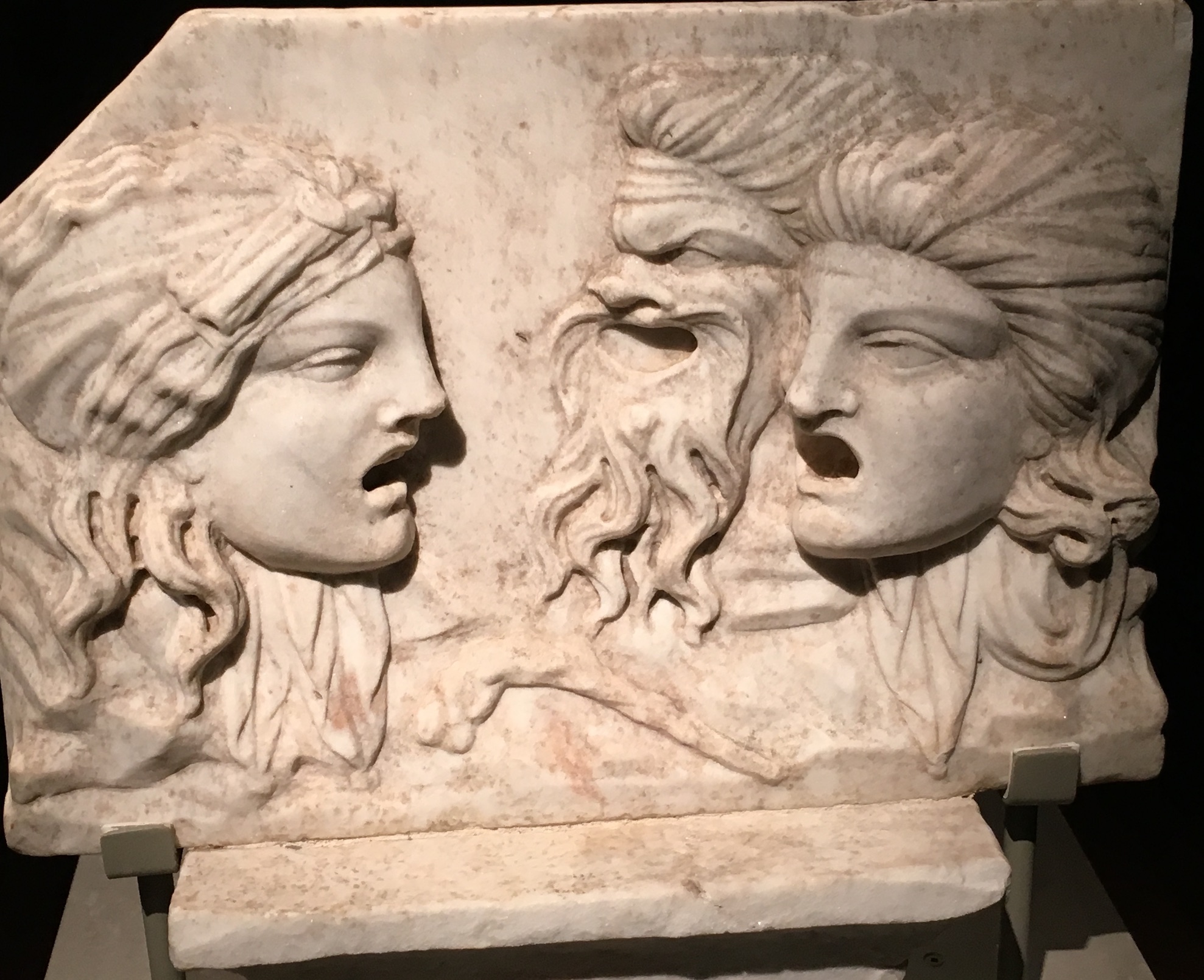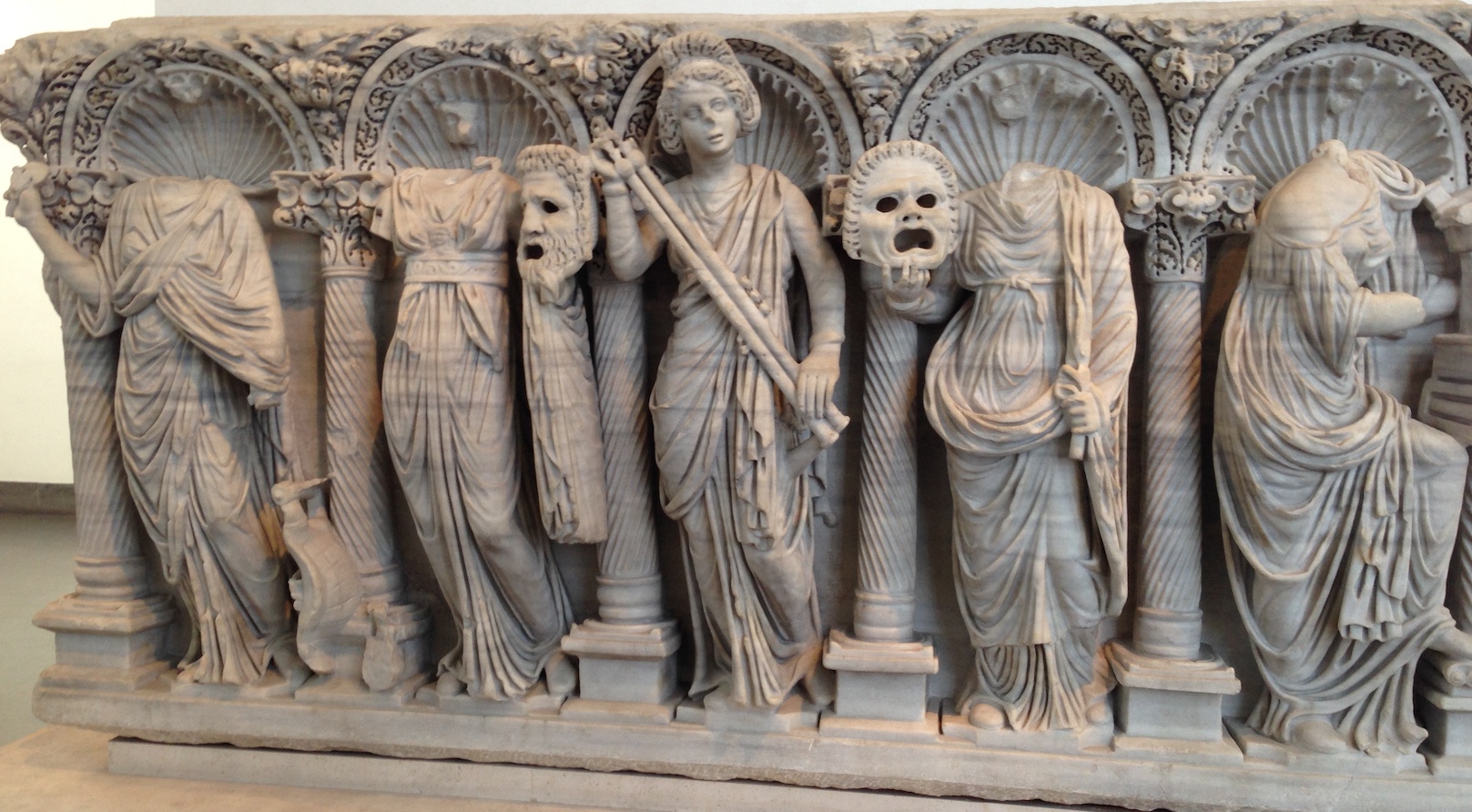 Pour ce qui est du théâtre, deux muses grecques inspiraient les dramaturges : Thalie (Θαλεια), muse de la Comédie, et Melpomène (Μελπομενη), d’abord muse du chant, puis de la Tragédie (où de nombreux passages étaient chantés). Dans la sculpture, elles sont représentées tenant des masques, comme on le voit sur ce sarcophage exposé au Palazzo Massimo (Rome), et sur cette statue de Melpomène (Art Institute Museum, Chicago).