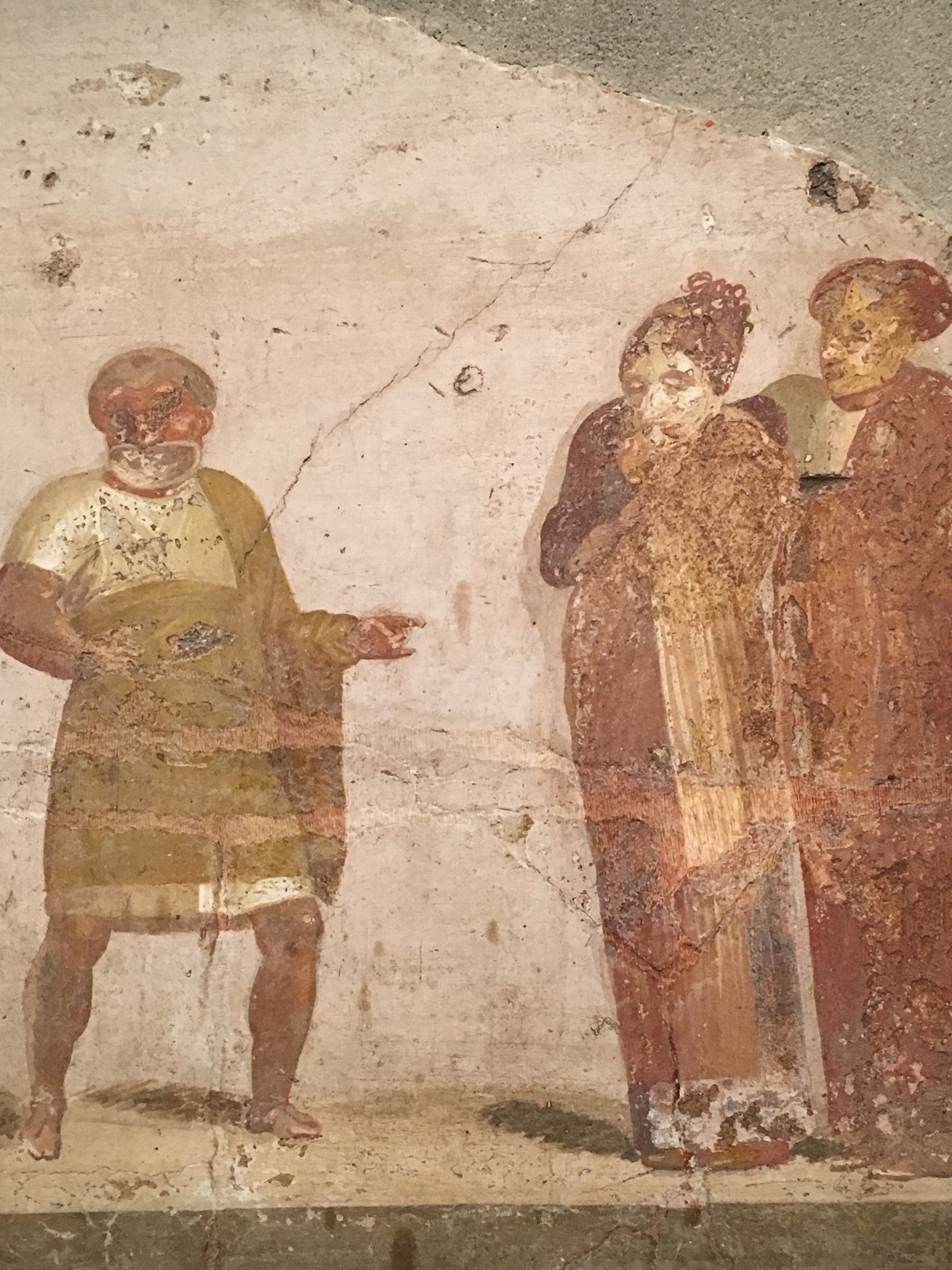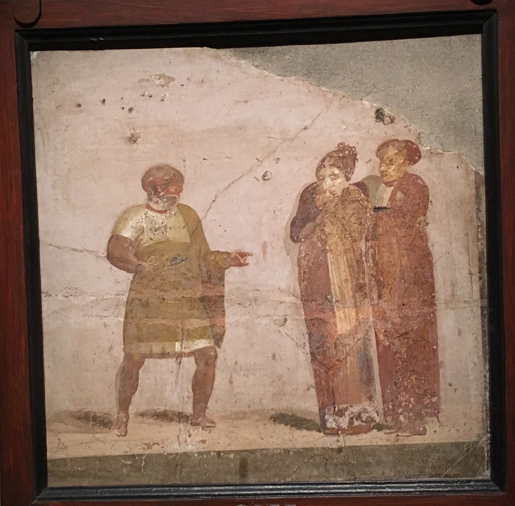 Le port du masque autorisait un même acteur à jouer plusieurs rôles (y compris, naturellement, les rôles féminins), voire à deux acteurs de se partager un rôle (Dictionnaire de l’Antiquité, ibid.). Dans la scène théâtrale ci-dessous (enduit peint de Pompéi, présenté à Montréal en 2016), on sait, d’après leurs masques, que sont représentés à gauche un esclave (tunique courte, teint rubicond), au centre une courtisane (visage blanc, longue robe bariolée avec du jaune) et à droite un jeune homme qui soutient la femme qu’il aime.