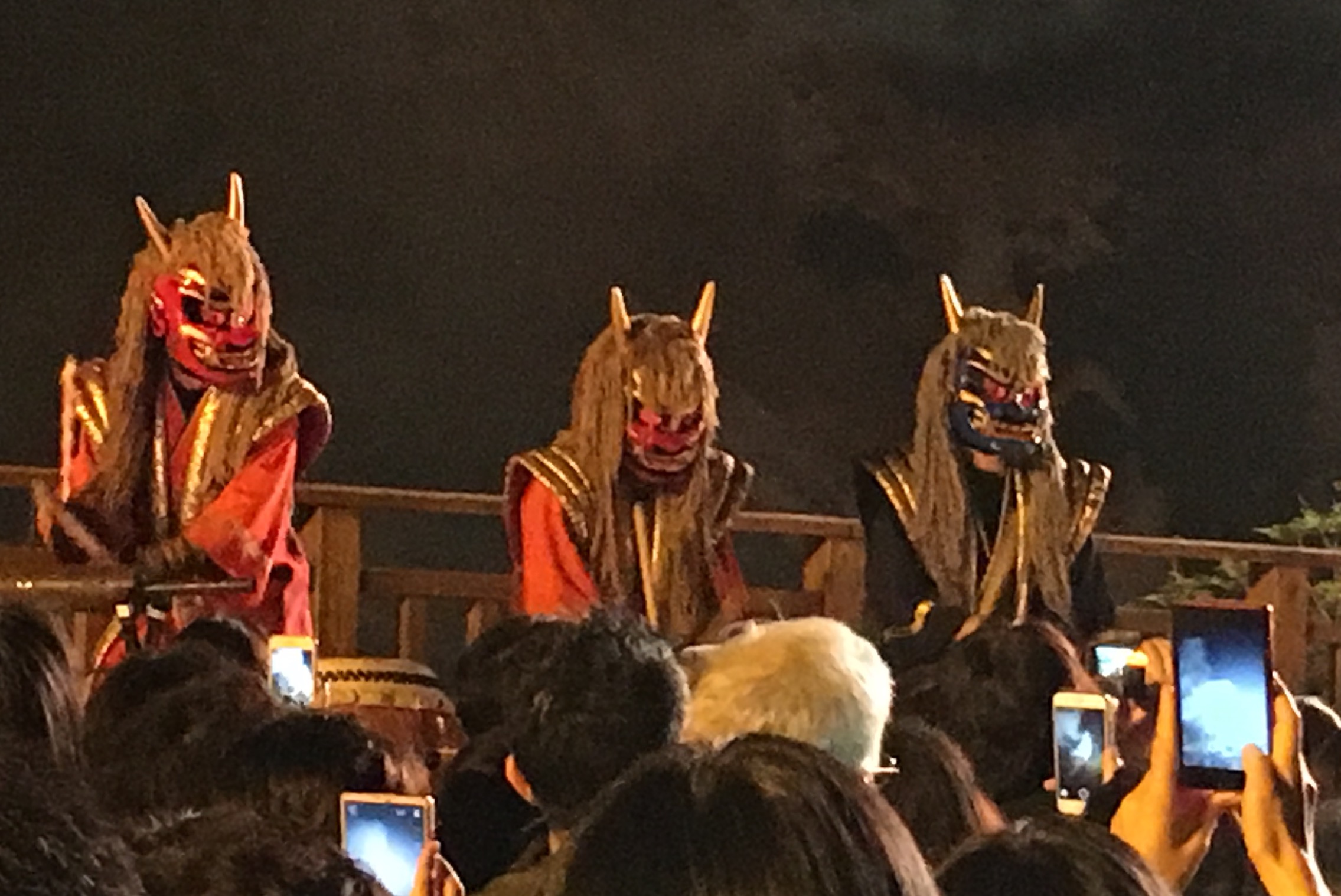 Ces personnages aux masques de théâtre ou de déguisement appartiennent au folklore, d’ailleurs toujours vivant pour les Japonais et les touristes.