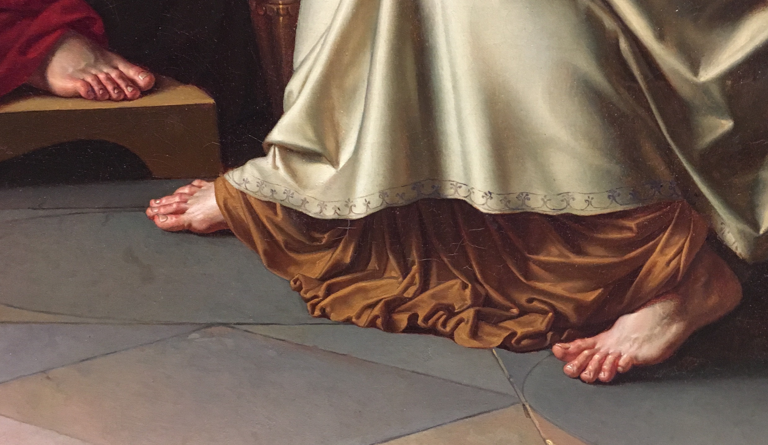 Quant aux diagonales, elles se coupent sur la manche d’Auguste, mettant en valeur le geste de sa main. Veut-il apaiser le ton de Virgile (peut-être emporté par son élan oratoire), ou ralentir son discours, ou même le stopper (car Livie s’est trouvée mal) ? On remarque avec intérêt la proximité des mains des deux hommes et leur complémentarité : l’une verticale, l’autre horizontale. C’est un moment de tension dramatique.