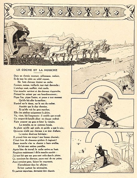 D’autre part, la mouche représente le pseudo-homme d’action, agile, fébrile, inutile et revendicateur : c’est la mouche du coche, dans la fable, qui réclame son salaire, après n’avoir fait qu’imiter les travailleurs — poursuit l’article définissant la “mouche” (Symboles, ibid.). Il est fait ici allusion à l’apologue “Le Coche et la Mouche” de Jean de La Fontaine (Fables, VII, 9 ; paru en 1678), dont la morale, visant d’abord les courtisans du roi Louis XIV, est devenue universelle : Ainsi certaines gens, faisant les empressés,/S’introduisent dans les affaires :/Ils font partout les nécessaires,/Et, partout importuns, devraient être chassés.