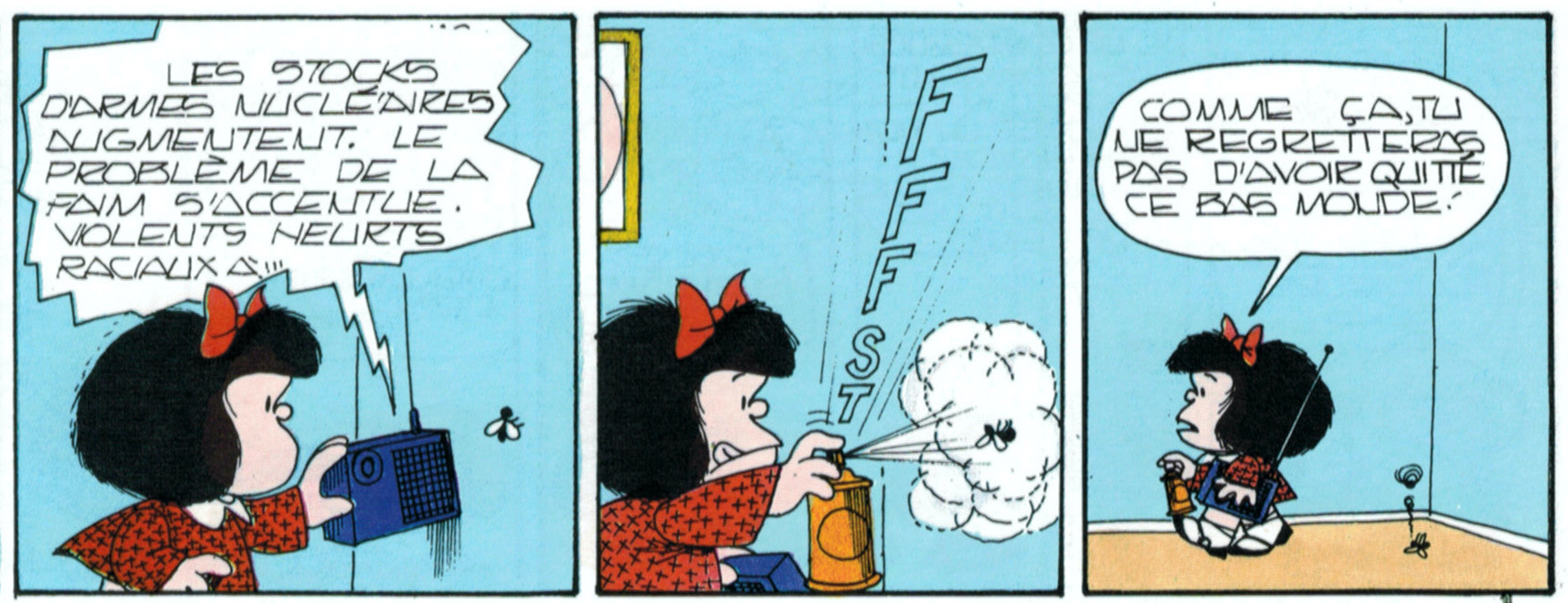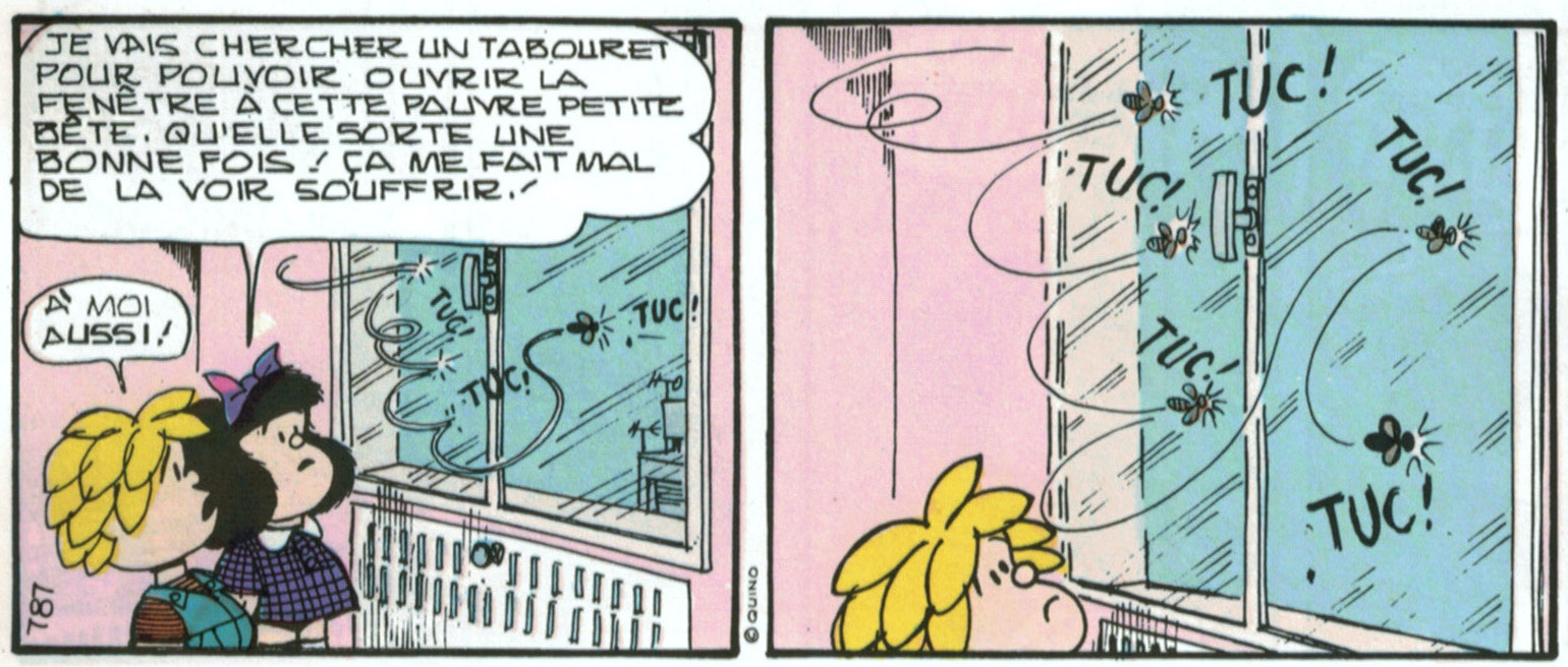 La mouche (qu’elle soit “verte” ou “noire”, “domestique”, “à chevreuil”, “à merde”, “tsé-tsé”, “drosophile”, “cantharide” etc.) apparaît donc comme un insecte à éliminer sans ménagements. D’où l’invention, au XXè siècle, du “papier tue-mouches”, et du Fly Tox (produit en aérosol toxique pour les mouches), dont fait parfois usage la jeune héroïne argentine Mafalda, créée par Quino, alors que, souvent, observer une mouche la fait réfléchir.