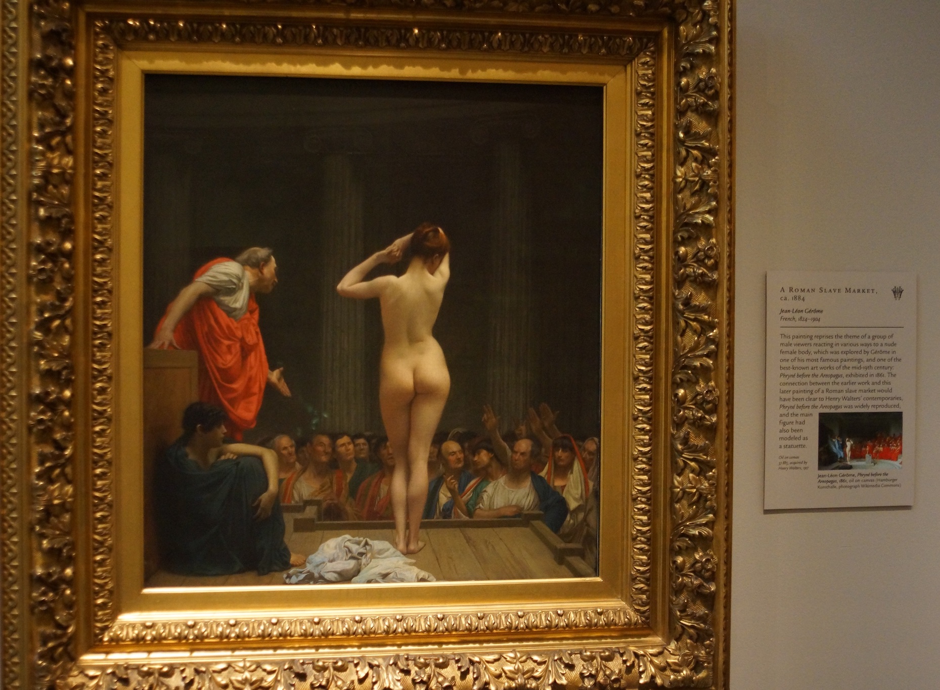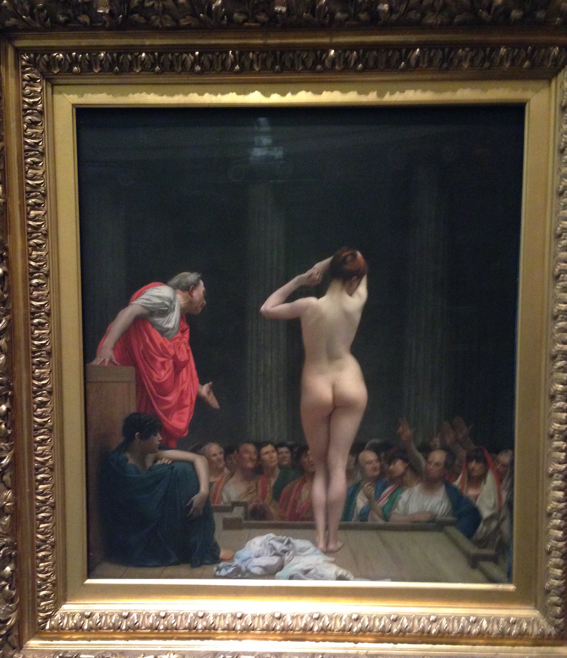 Cette peinture reprend le thème d’un groupe d’hommes réagissant devant un corps de femme nue — thème déjà traité par J-L Gérôme dans le très célèbre tableau Phryné devant l’Aréopage (1861), connu des contemporains américains de Henry Walters, amateur d’art.