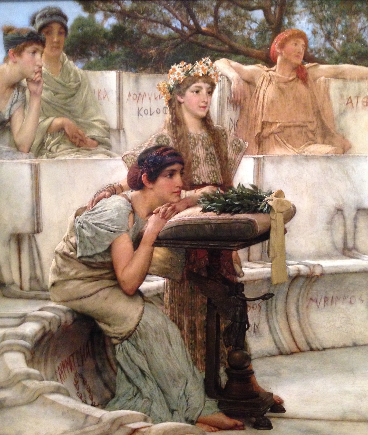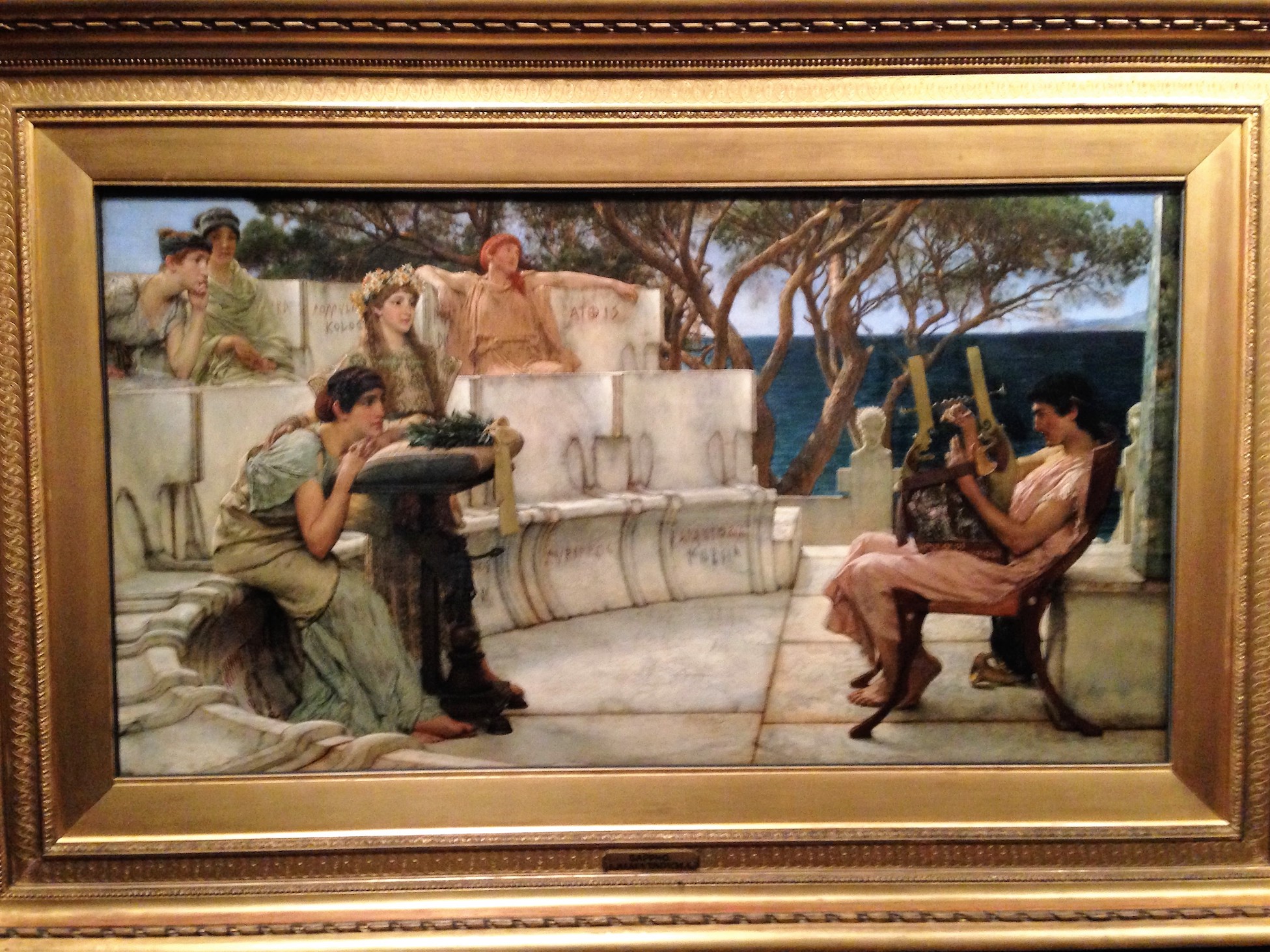 Sur cette petite toile (47 x 26 cm), exposée au Musée Walters de Baltimore et datée de 1881, le peintre britannique sir Lawrence Alma-Tadema représente la poétesse, entourée de jeunes Hellènes, dans un odéon — un édifice principalement destiné à la musique et à la poésie chantée (comme les odes). Assise près d’une couronne de lauriers (symbole d’Apollon, dieu des Arts), Sapho écoute passionnément un joueur de lyre (ou cithare) — symbole des accents lyriques de sa propre poésie.