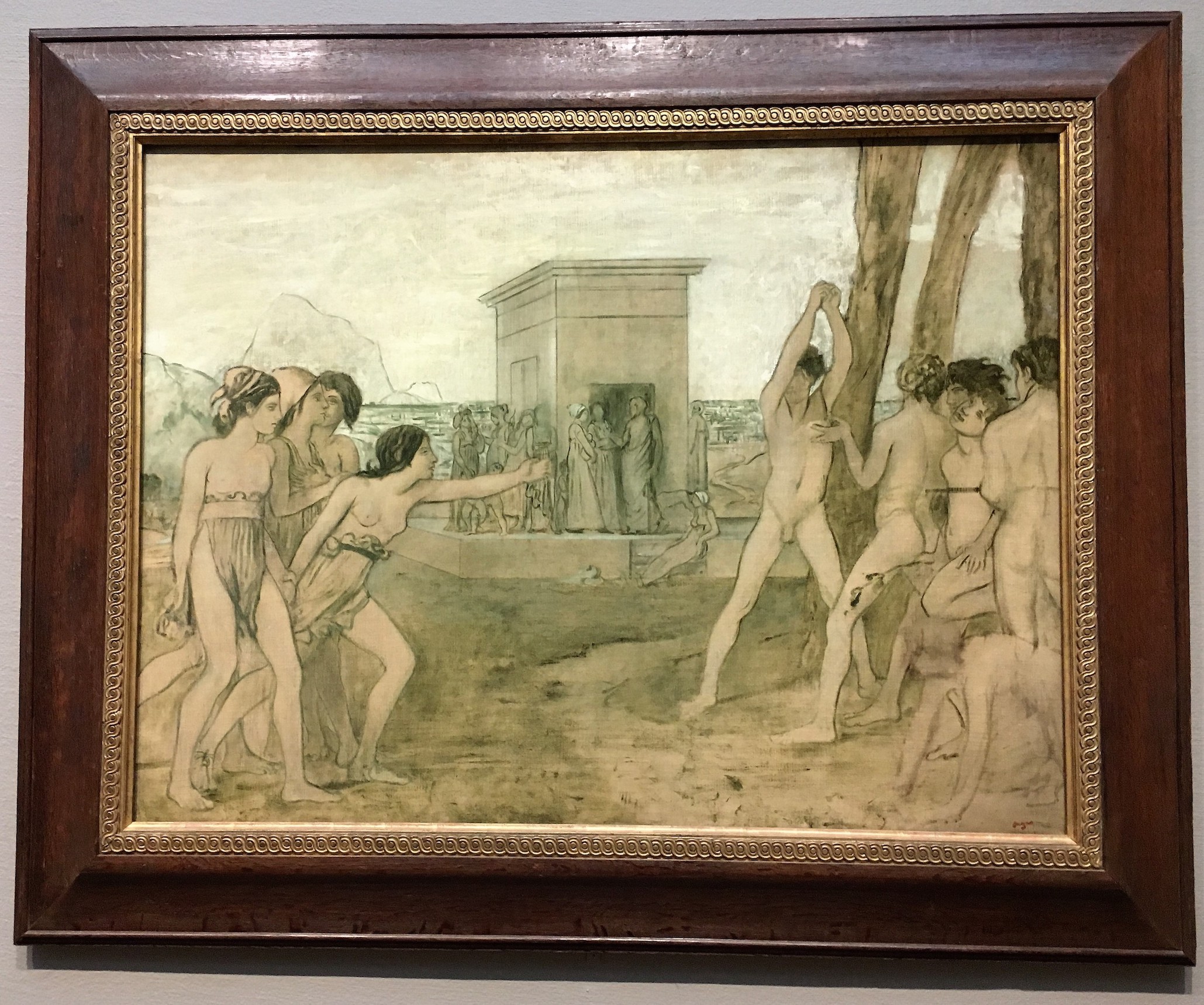 Cette huile sur toile, exécutée par le peintre Edgar Degas (c. 1860) et exposée au Art Institute Museum de Chicago, est l’esquisse d’un tableau inachevé, dont la seconde version se trouve actuellement à la National Gallery of Art de Londres. Selon son titre (en anglais, Young Spartan Girls Challenging Boys), la scène, pleine de vivacité, représente des jeunes filles et des garçons de Sparte, qui, au vu de leurs gestes, se défient dans des exercices gymniques. Les garçons sont nus ; deux des jeunes filles au premier plan portent une sorte de pagne.