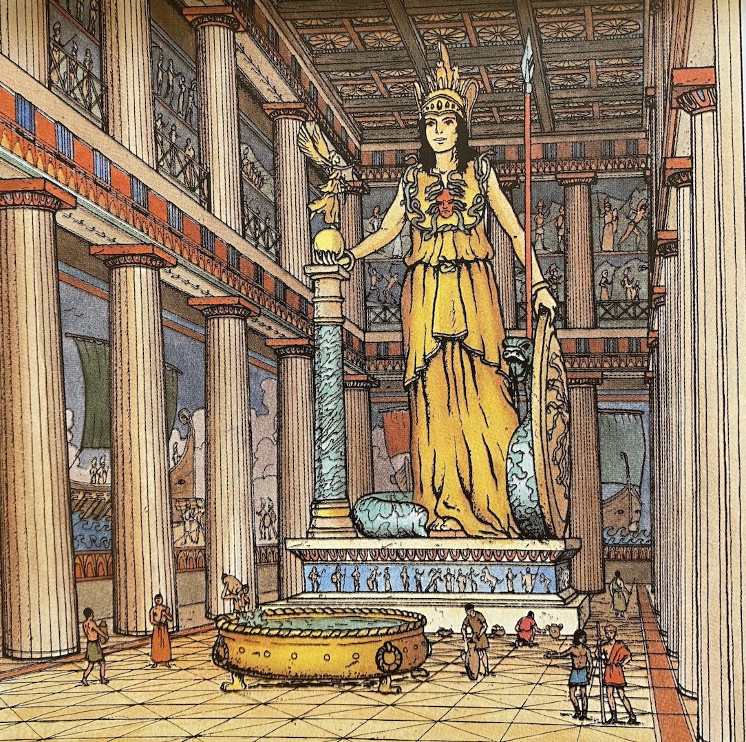 D’ailleurs, les Grecs qualifiaient le dieu Apollon de Chrysocomès, épithète signifiant “aux cheveux blonds” — le blond étant la couleur des dieux et héros. Et sur l’Acropole d’Athènes, dans le temple du Parthénon qui lui était consacré, la déesse Athéna était représentée sous la forme d’une statue chryséléphantine, c’est-à-dire d’or et d’ivoire (ἐλέφας signifie “l’éléphant”, et ses défenses d’ivoire). Cette statue colossale, d’une hauteur de 12 mètres (ou 15 mètres, en incluant le socle), était l’œuvre du sculpteur Phidias, qui, avec les architectes Ictinos et Callicratès, bâtit et décora ce temple entre 447 et 438 avant notre ère (Dictionnaire de l’Antiquité, coll. Bouquins, p. 724).