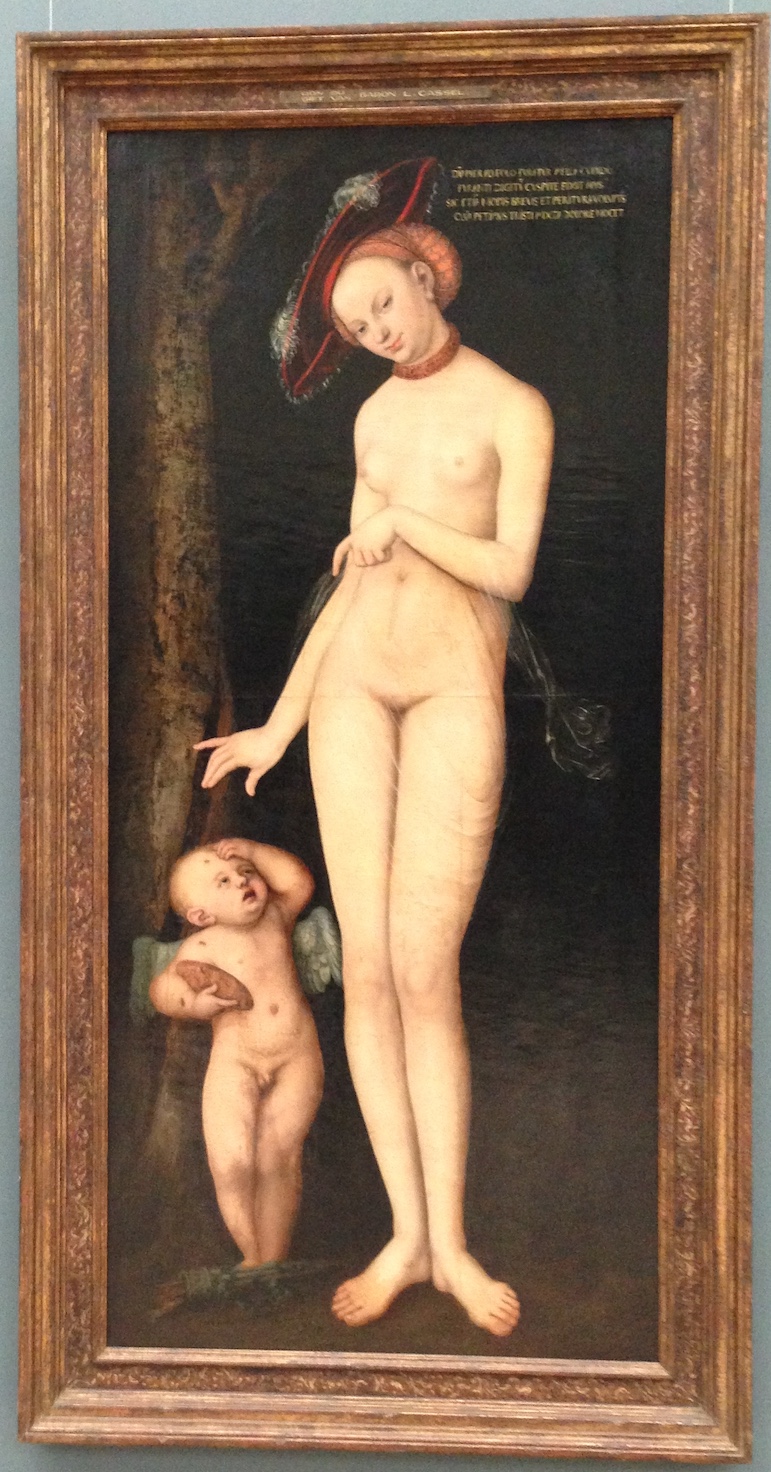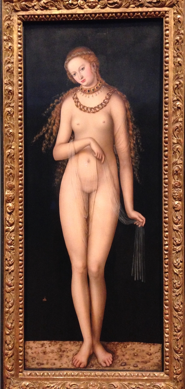 À peine voilée est la Vénus de Lucas Cranach l’Aîné, qui a peint plusieurs tableaux au thème gréco-romain. Peindre des personnages mythologiques lui servit souvent de prétexte pour peindre la nudité. En effet, le Nu féminin était un des sujets de prédilection de Cranach, autant que de ses commanditaires ! Le voile-alibi dont est enveloppée Vénus est transparent — au Musée des Beaux-Arts d’Ottawa (huile sur tilleul, 1518) comme aux Musées royaux de Bruxelles (peinture à l’huile, 1531).