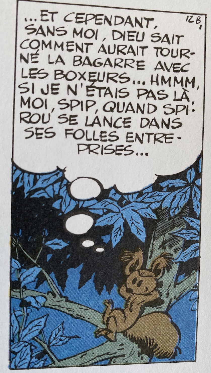 Les héros de BD ont souvent des amis animaux (Tintin avec son chien Milou, Obélix avec Idéfix, Lucky Luke et son cheval Jolly Jumper etc.) qui partagent leurs aventures. Ces animaux parlent (ou pensent) et leurs commentaires apparaissent en contrepoint — ce qui crée un effet de distance comique avec le personnage “humain” : il semble ainsi moins raisonnable que sa mascotte. Tel est l’écureuil Spip, alter ego de Spirou, dont les commentaires sur son maître vif et remuant apportent une sagesse pleine d’humour.