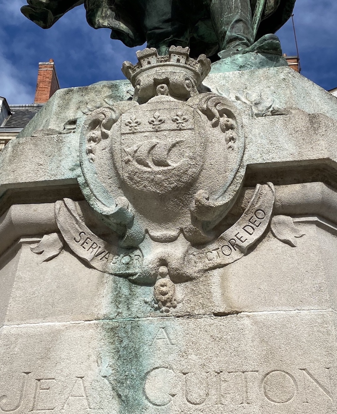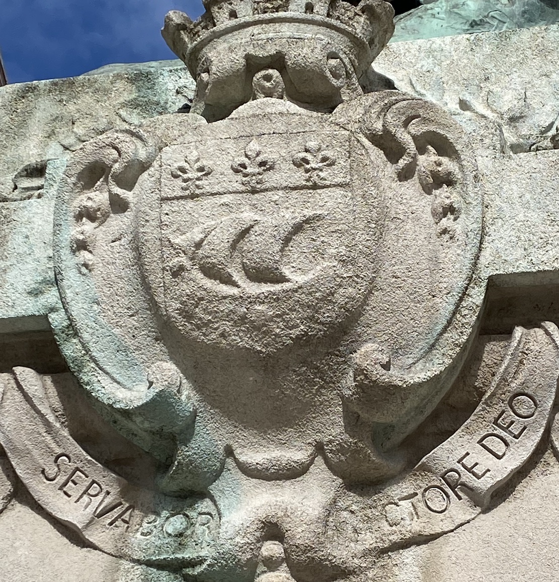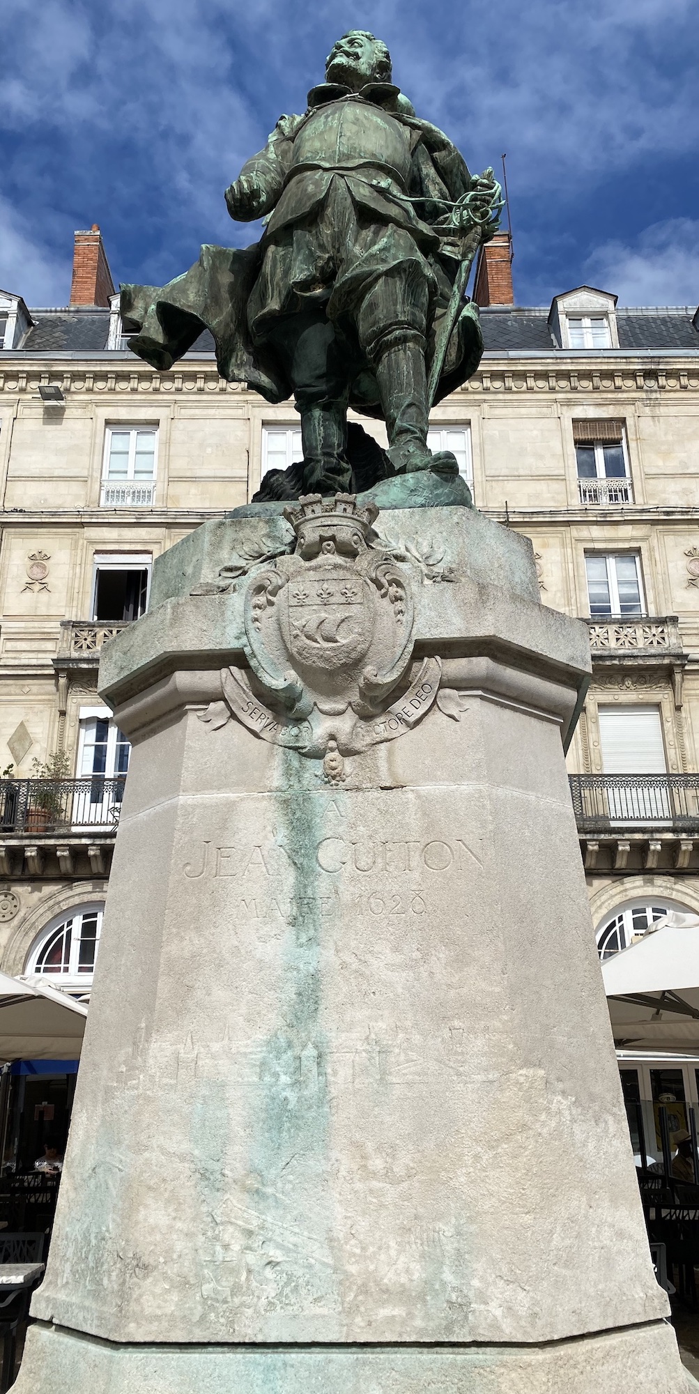 Autre symbole de La Rochelle, son blason armorial (et sa devise en latin). Je ne sais pas exactement à quelle date il a été créé, mais j’ai pu admirer ce blason taillé sur la pierre du piédestal de la statue de Jean Guiton érigée sur la place de l’Hôtel de Ville.