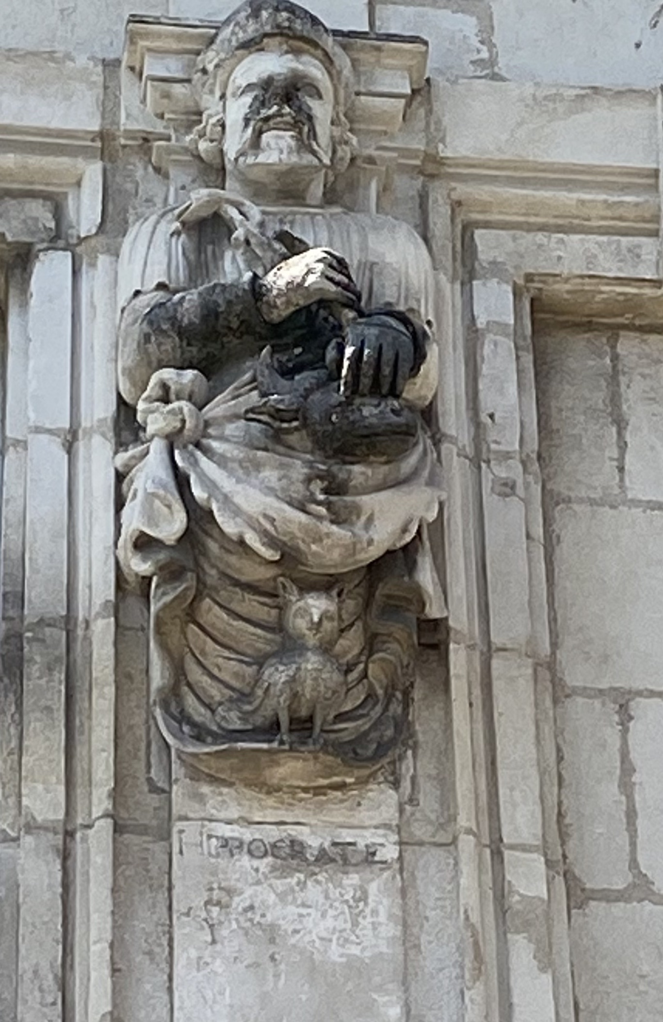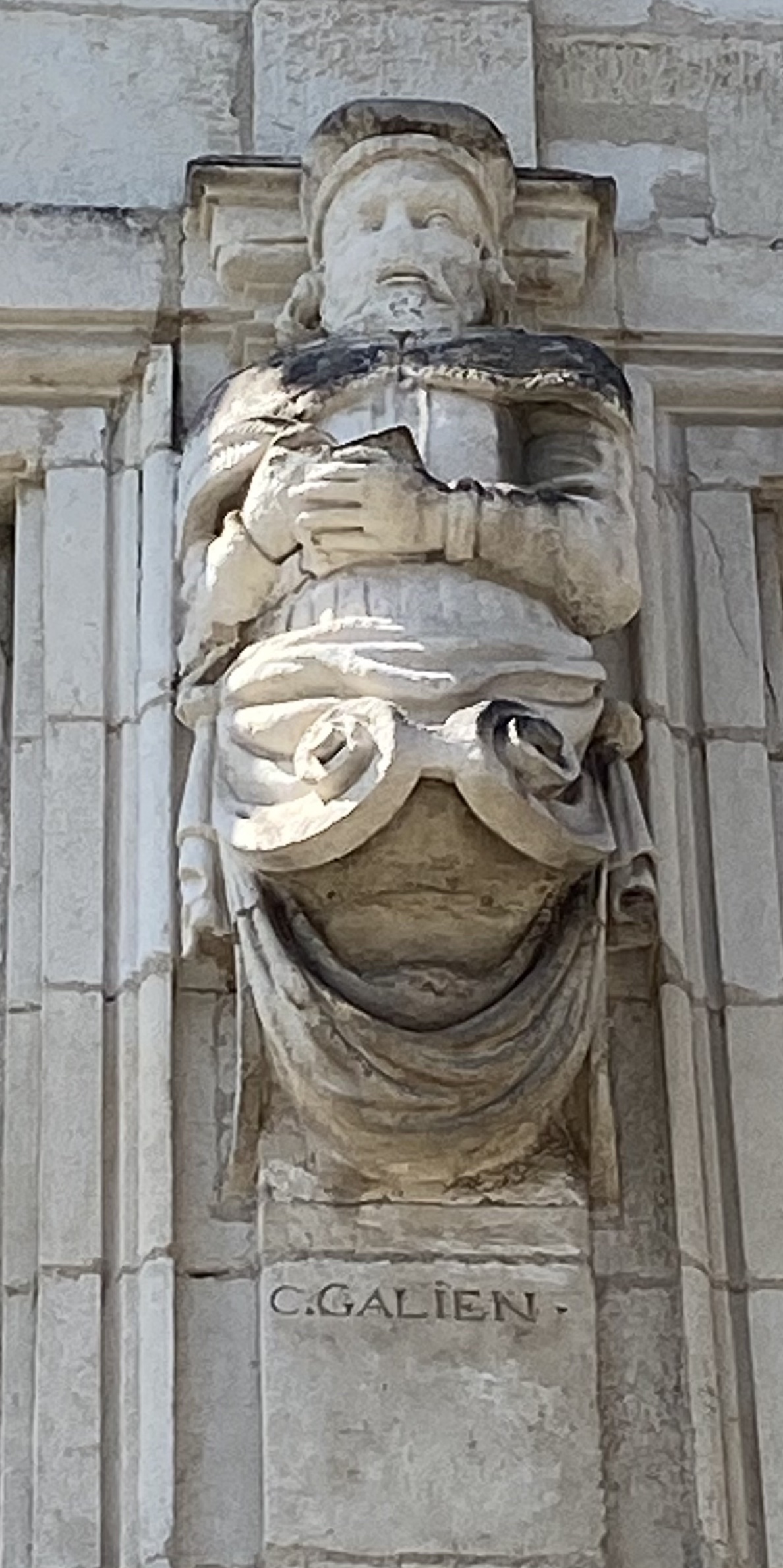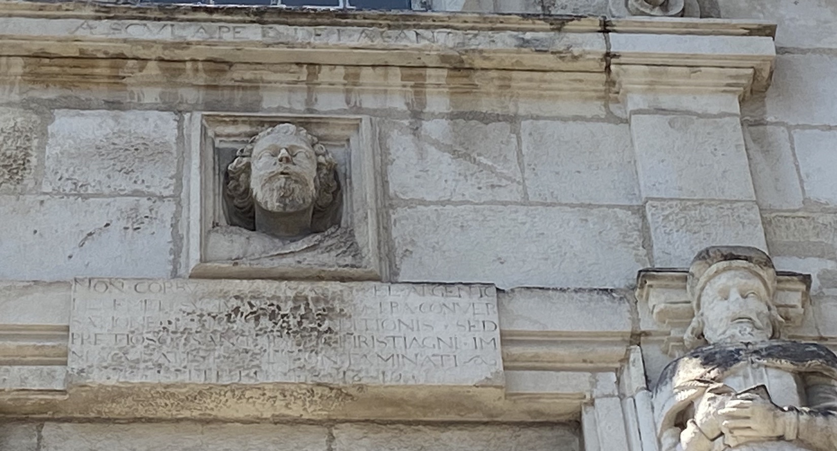 En haut de la façade, on distingue encore le nom latin du dieu Esculape (Aesculapius, dieu grec de la médecine), une inscription latine (devenue illisible), et les bustes d’Hippocrate et de Galien.