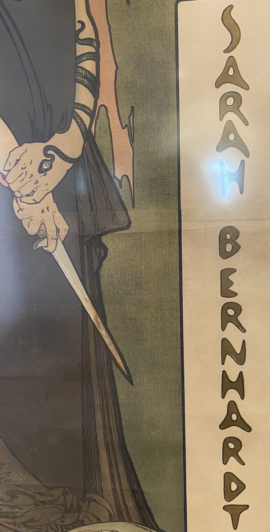 Ce bracelet fut imaginé par Mucha pendant qu’il dessinait l’affiche. Il paraît que Sarah Bernhardt le trouva si beau qu’elle demanda au bijoutier parisien Georges Fouquet de fabriquer pour elle un bracelet-serpent et une bague incrustée d’une pierre précieuse — bijoux qu’elle portait en jouant la pièce !