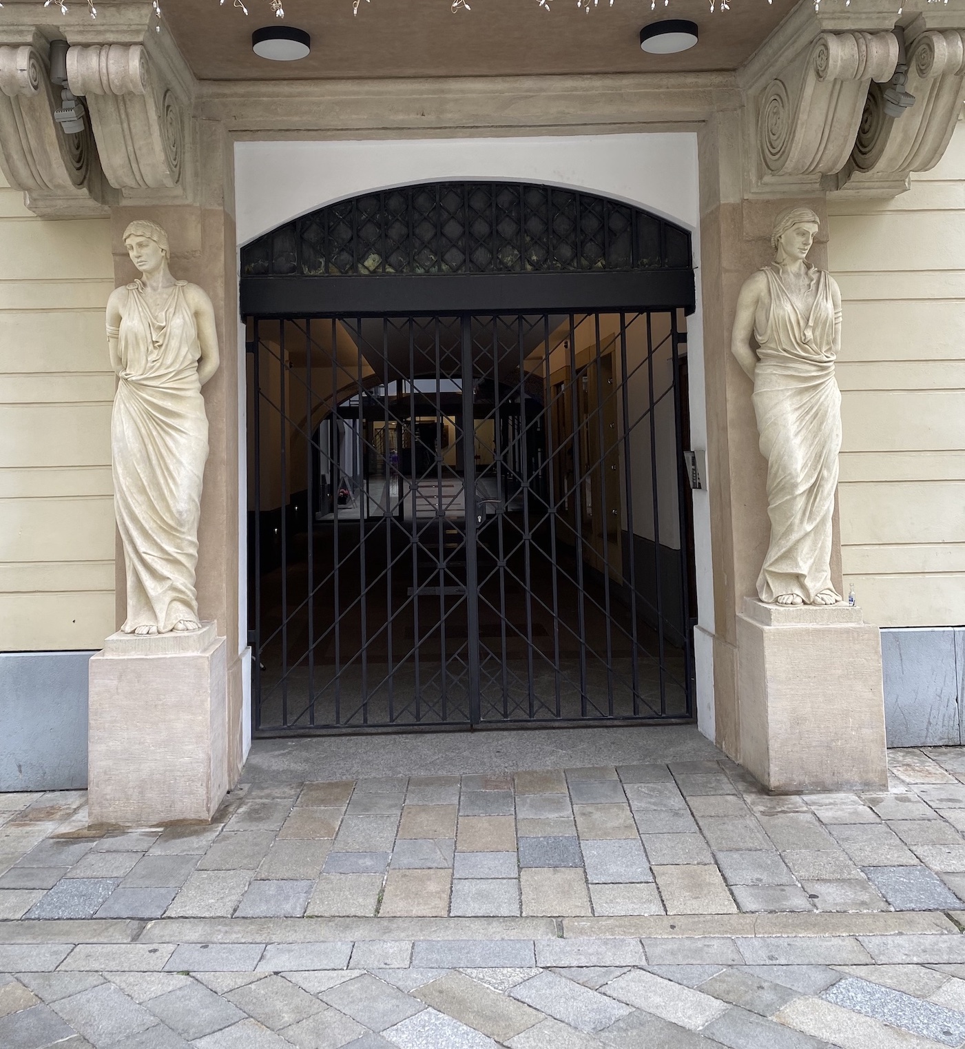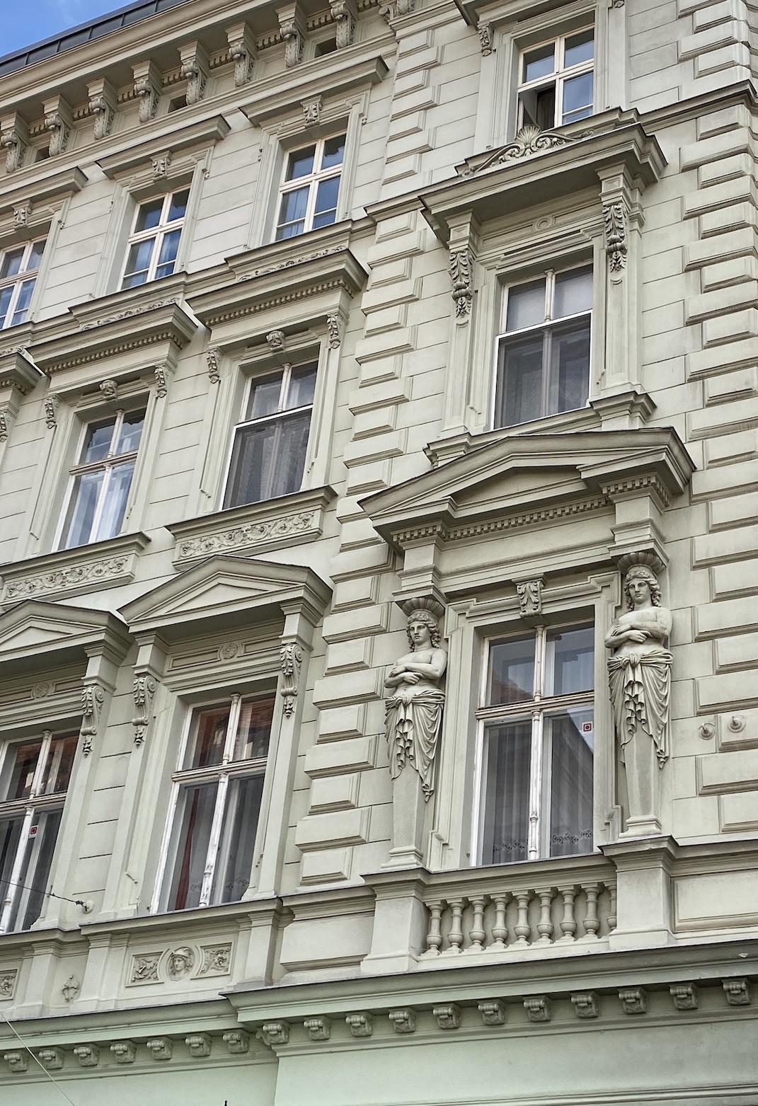 Le temps d’apercevoir encore quelques détails architecturaux d’inspiration grecque, comme ces fenêtres encadrées d’atlantes (hommes forts qui soutiennent des chapiteaux) ou ornées d’une frise à la grecque, ou encore cette porte ouvragée gardée par des caryatides,