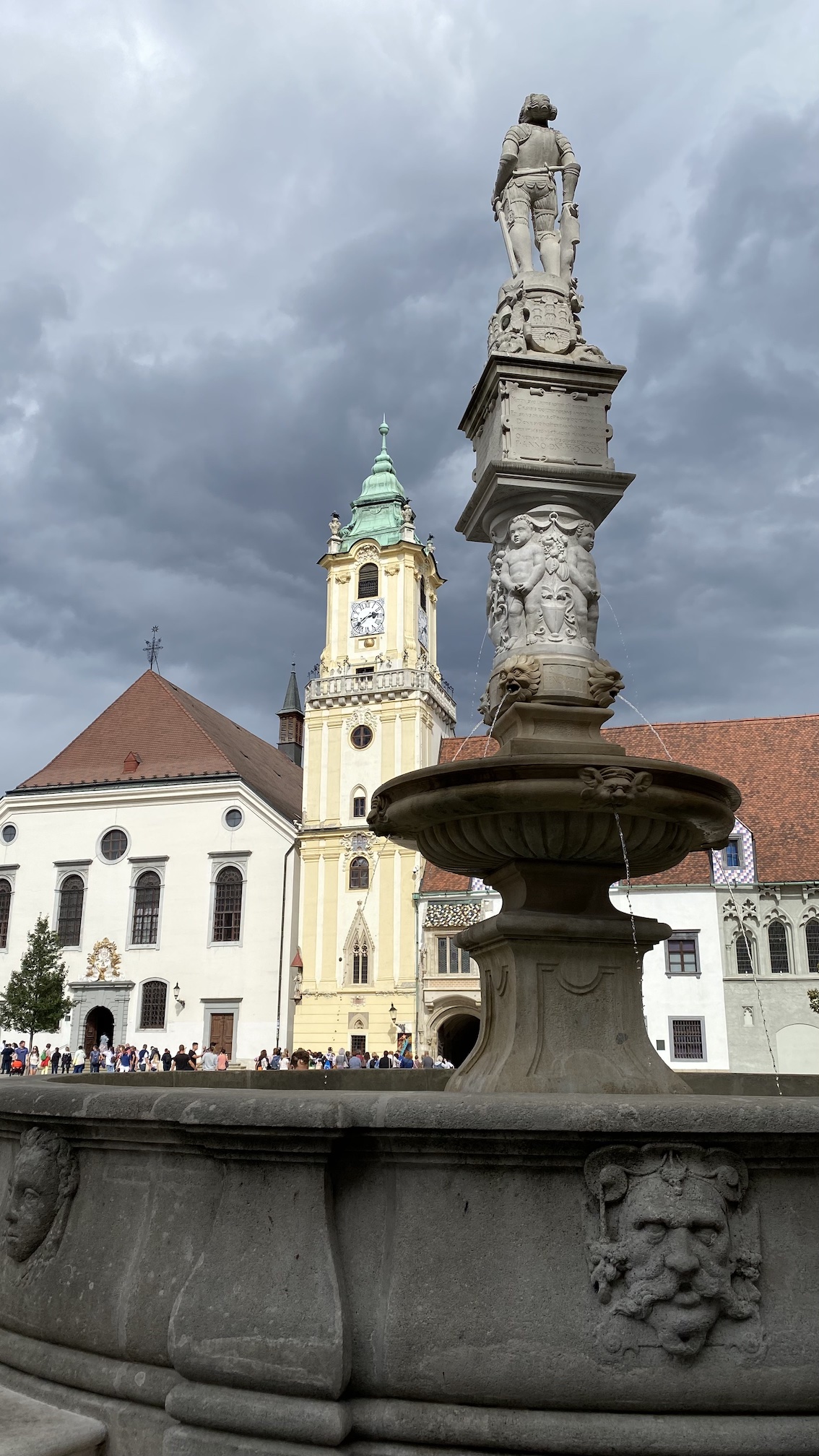Sur la même place principale, mais dans un registre profane, on peut voir un autre monument avec une colonne soutenant la statue d’un chevalier en armure : c’est la “Fontaine de Maximilien”, nommée ainsi pour honorer Maximilien II, roi de Hongrie, qui fit construire une fontaine pour alimenter en eau la population.