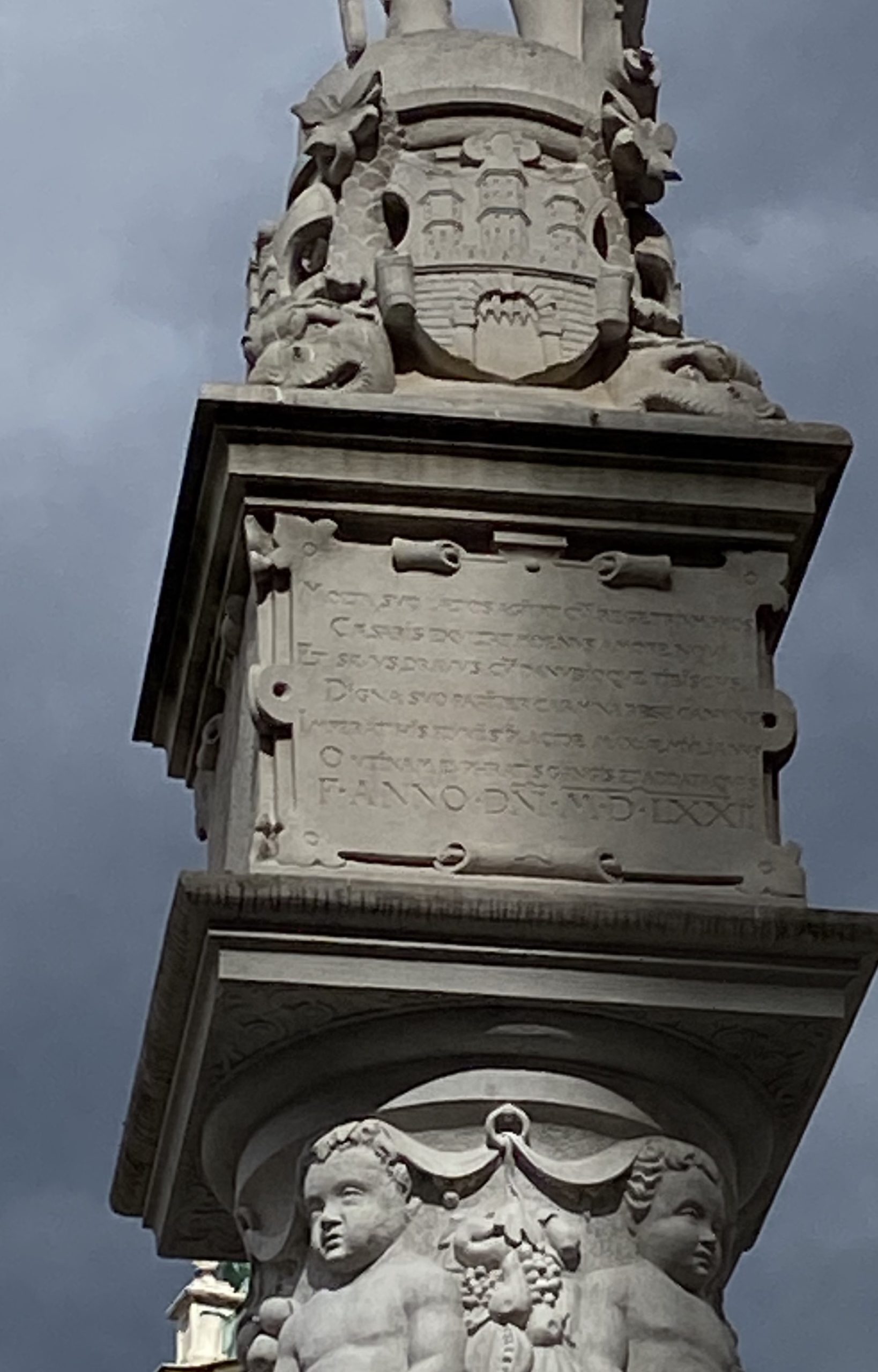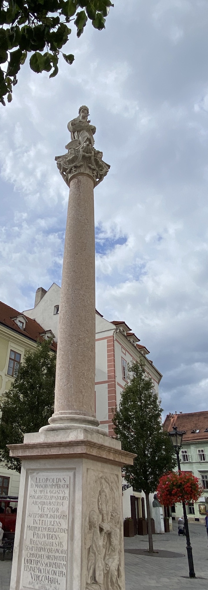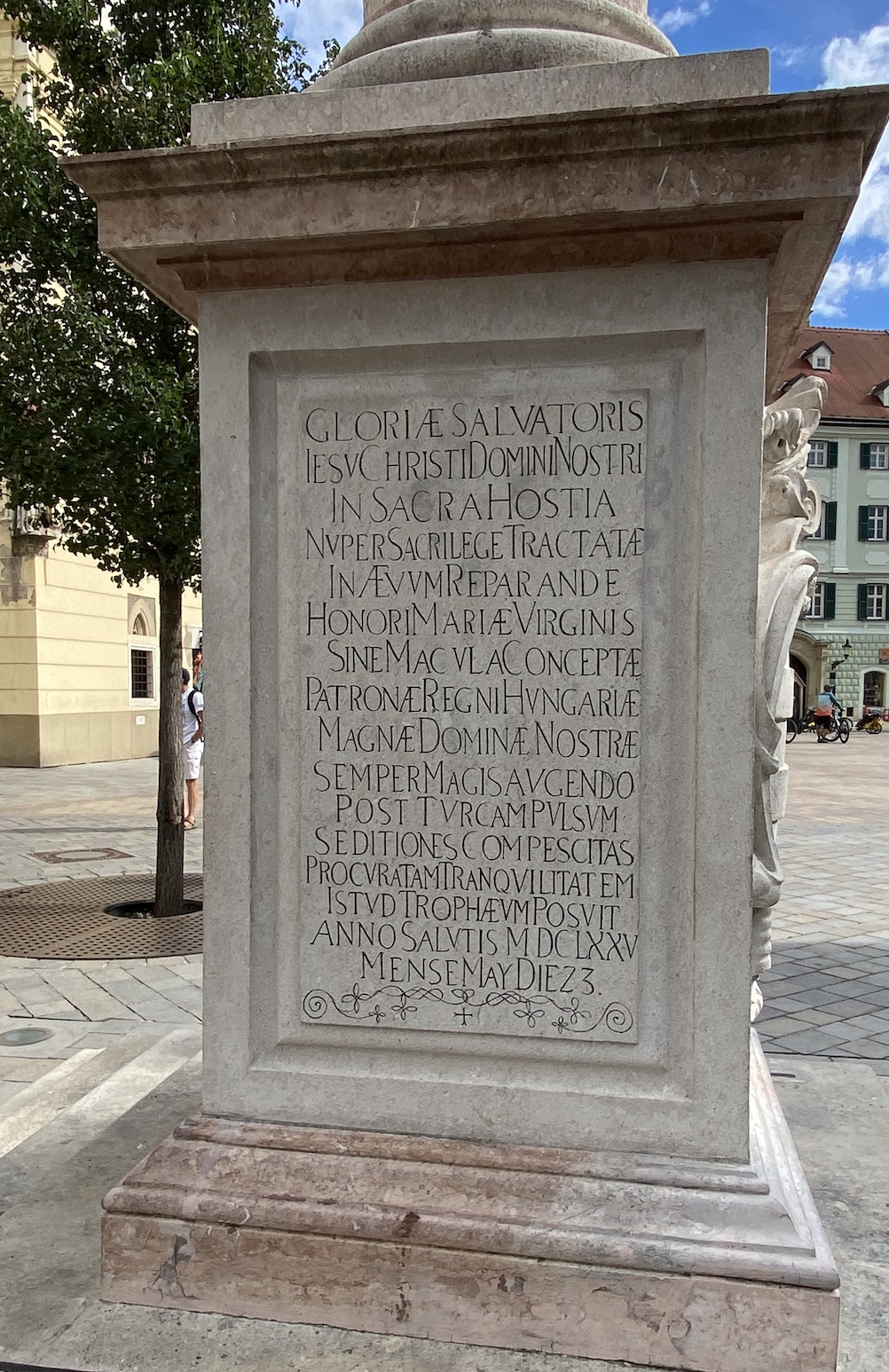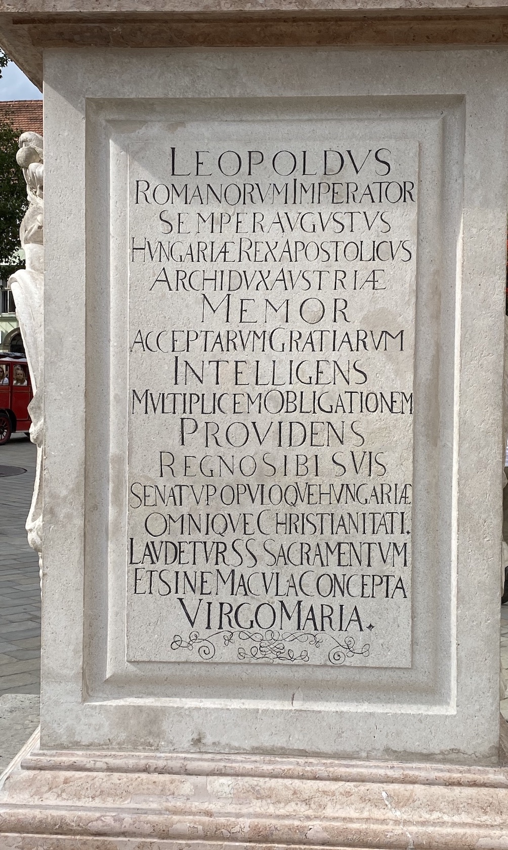 Les inscriptions de part et d’autre du socle sont la dédicace du roi Léopold de Hongrie (1640-1705) Leopoldus Romanorum imperator semper augustus Hungariæ rex …, qui, après une victoire sur les Turcs, fait ériger cette statue Honori Mariæ Virginis sine macula conceptæ Patronæ regni Hungariæ “en l’honneur de la Vierge Marie conçue sans péché patronne du royaume de Hongrie”— statue inaugurée en MDCLXXV, le 23 mai 1675.