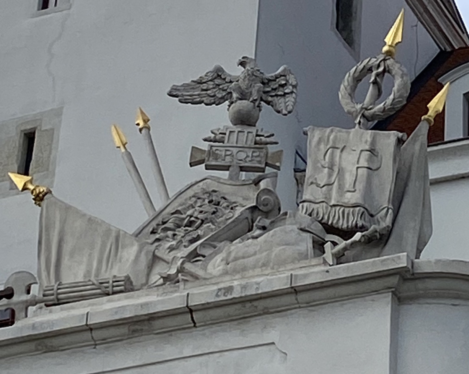 Si les petits canons révèlent la modernité, le sigle SPQR ainsi que l’aigle romaine et l’enseigne de légion affirment symboliquement une filiation de l’ex-Saint-Empire romain germanique envers la Rome antique.