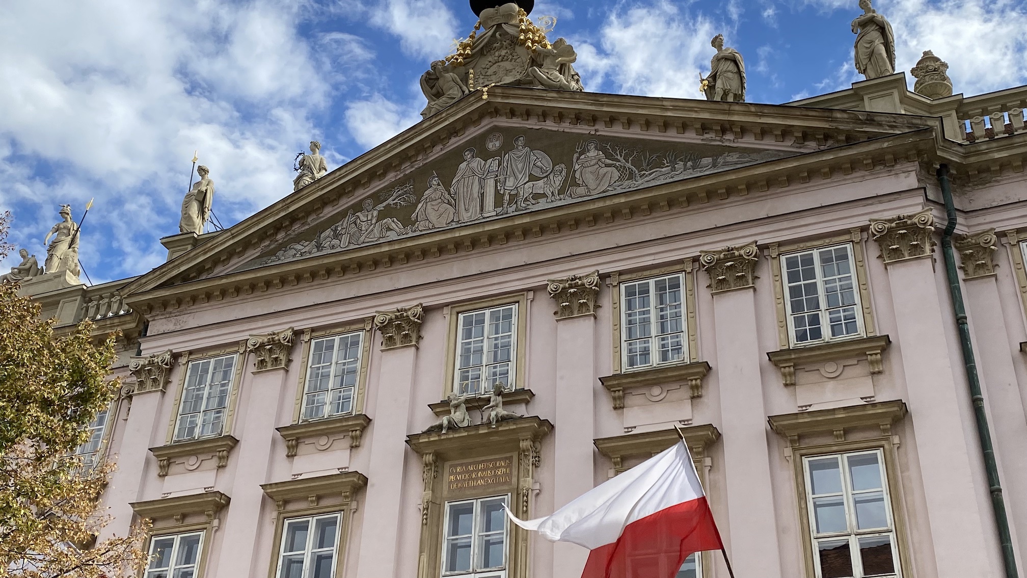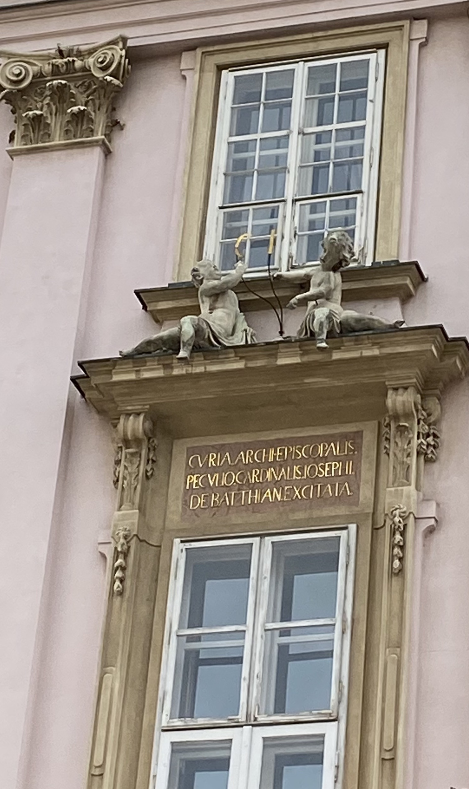 L’inscription en latin ecclésiastique Curia archi-episcopalis peculio cardinalis Josephi Debatthiane excitata signifie : “Archevêché (ou Curie archi-épiscopale) érigé avec l’argent du cardinal Josef Batthyanyi” (qui en fut le premier propriétaire). Le toit bordé d’une balustrade est orné de statues figurant des personnages de l’Antiquité. On en aperçoit un qui tient une couronne de laurier dans la main, un autre qui porte l’uniforme d’un soldat ou d’un empereur romain. On distingue nettement la déesse Athéna/Minerve à ses attributs : la lance et le bouclier, lui-même représentant la tête de Méduse. Quant au fronton, il est décoré de personnages peints, habillés à l’antique de tuniques et péplums, censés représenter les qualités humaines du cardinal.