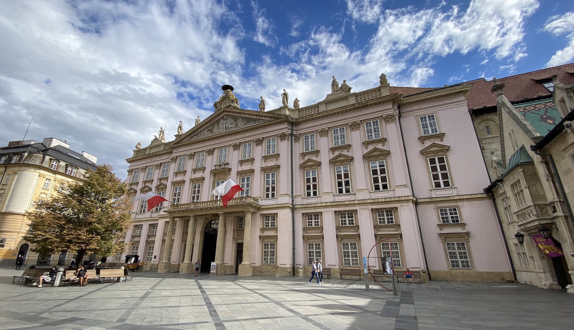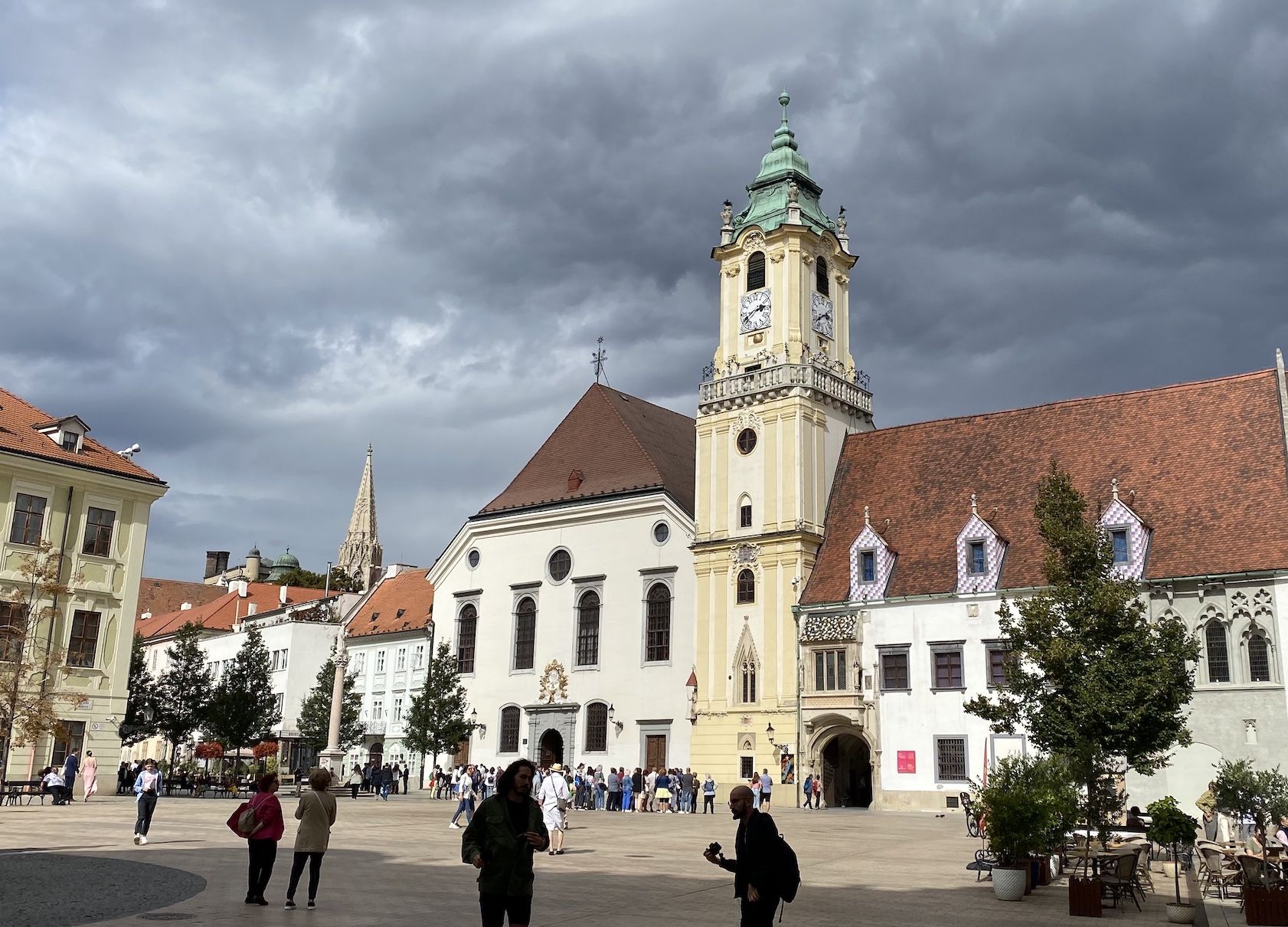 Derrière cet imposant immeuble se trouve la place principale de la vieille ville de Bratislava, sur les côtés de laquelle s’alignent diverses ambassades et bâtiments prestigieux, notamment l’ancien hôtel de ville (dont la construction s’est étalée du XIIIè au XVIè s.), avec sa tour.
